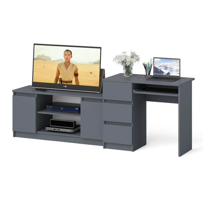 Комплектация включает стол компьютерный Мори МС-6 левый и тумбу ТВ Мори МТВ1200.1. Продуманная конструкция позволяет убрать лишние предметы, тем самым сохраняя единый стиль оформления помещения. Отсутствие ручек главное преимущество данной модели. Роль ручек выполняют сами фасады. Небольшой Стол Мори МС-6 левый компьютерный с тумбой и выдвижной панелью для клавиатуры. Тумба имеет три выдвижных ящика на роликовых направляющих. Стол компьютерный три ящика Мори МС-6 левый не имеет универсальной сборки - выдвижные ящики расположены слева. Тумба ТВ Мори МТВ1200.1 состоит из открытой ниши по центру и двумя закрытыми распашными дверками по краям. Все ниши имеет полочку по середине. На тумбе достаточно места для размещения телевизора диагональю 47 дюймов. Можно использовать как ТВ тумбу, так и обычную для хранения и размещения Ваших вещей.