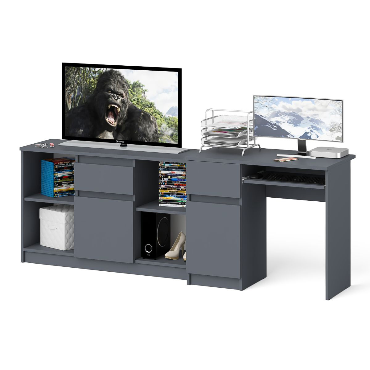 Комплектация включает стол компьютерный Мори МС-1 левый и тумбу ТВ Мори МТВ1204.1. Продуманная конструкция позволяет убрать лишние предметы, тем самым сохраняя единый стиль оформления помещения. Отсутствие ручек главное преимущество данной модели. Роль ручек выполняют сами фасады. Небольшой стол компьютерный Мори МС-1 левый с тумбой и выдвижной панелью для клавиатуры. Тумба имеет нишу с полочкой за распашной дверкой и выдвижной ящик на роликовых направляющих. Стол компьютерный Мори МС-1 левый не имеет универсальной сборки - выдвижной ящик расположен слева. Тумба ТВ Мори МТВ1204.1 состоит из двух открытых ниш по бокам и ящика и закрытой нишей по центру. Все ниши имеет полочку по середине. На тумбе достаточно места для размещения телевизора дигональю 47 дюймов. Можно использовать как ТВ тумбу, так и обычную для хранения и размещения Ваших вещей.