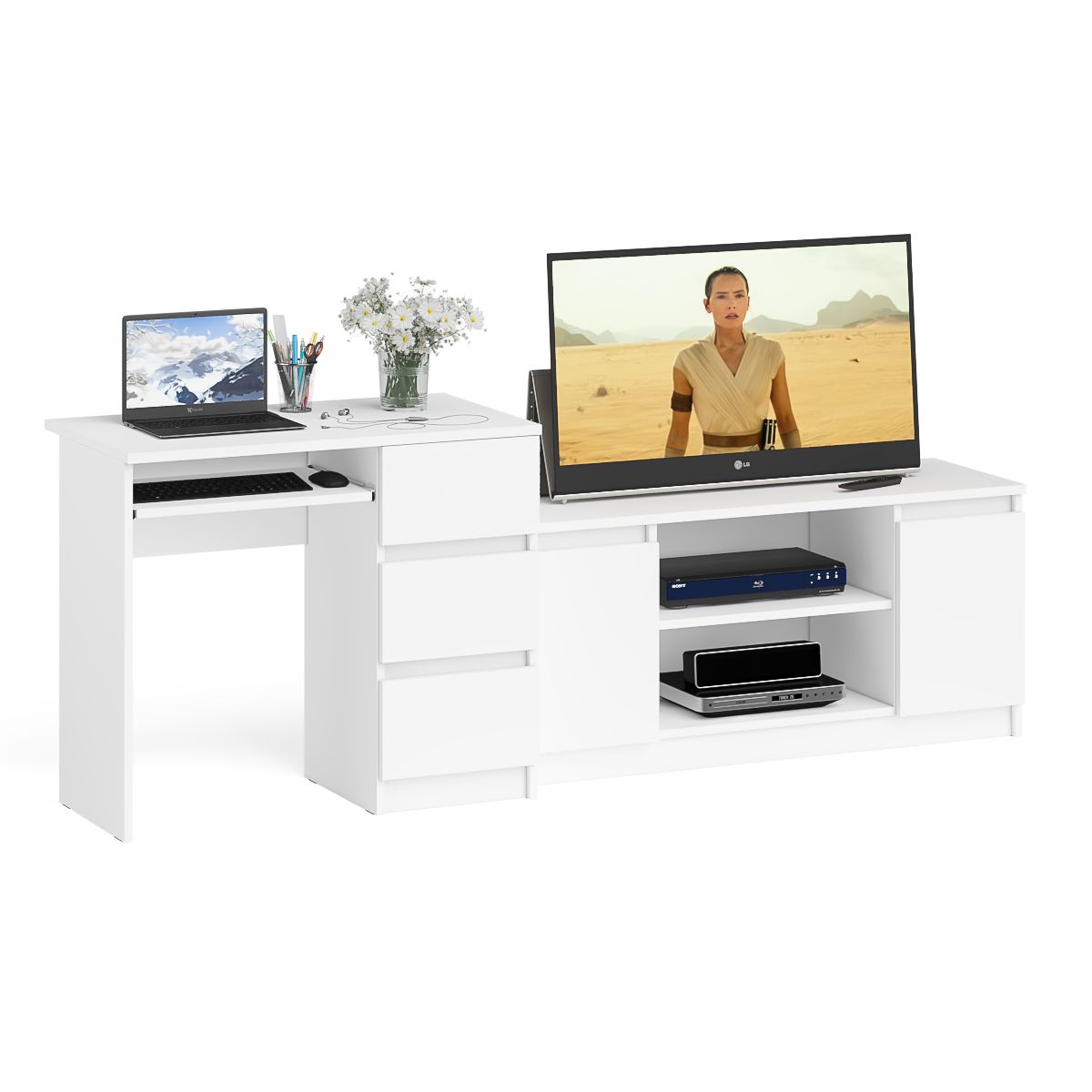 Комплектация включает стол компьютерный Мори МС-6 правый и тумбу ТВ Мори МТВ1200.1. Продуманная конструкция позволяет убрать лишние предметы, тем самым сохраняя единый стиль оформления помещения. Роль ручек выполняют сами фасады. Аккуратный стол Мори МС-6 компьютерный правый с тумбой и выдвижной панелью для клавиатуры. Тумба имеет три выдвижных ящика на роликовых направляющих. Стол компьютерный три ящика Мори МС-6 правый не имеет универсальной сборки - выдвижные ящики расположены слева. Тумба ТВ Мори МТВ1200.1 состоит из открытой ниши по центру и двумя закрытыми распашными дверками по краям. Все ниши имеет полочку по середине. На тумбе достаточно места для размещения телевизора диагональю 47 дюймов. Можно использовать как ТВ тумбу, так и обычную для хранения и размещения Ваших вещей.