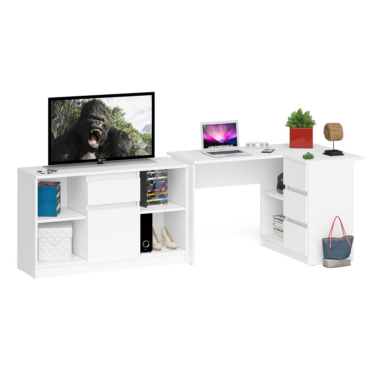 Комплектация включает стол компьютерный Мори МС-16 правый и тумбу ТВ Мори МТВ1204.1. Продуманная конструкция позволяет убрать лишние предметы, тем самым сохраняя единый стиль оформления помещения. Роль ручек выполняют сами фасады. Угловой компьютерный стол Мори МС-16 правый - конструктивно тумба со столешницей образуют угол. Тумба имеет 3 выдвижных ящика и нишу с полкой по середине. Угловой компьютерный стол Мори МС-16 правый не универсален при сборке - тумба с ящиками располагается справа. Тумба ТВ Мори МТВ1204.1 состоит из двух открытых ниш по бокам и ящика и закрытой нишей по центру. Все ниши имеет полочку по середине. На тумбе достаточно места для размещения телевизора дигональю 47 дюймов. Можно использовать как ТВ тумбу, так и обычную для хранения и размещения Ваших вещей.