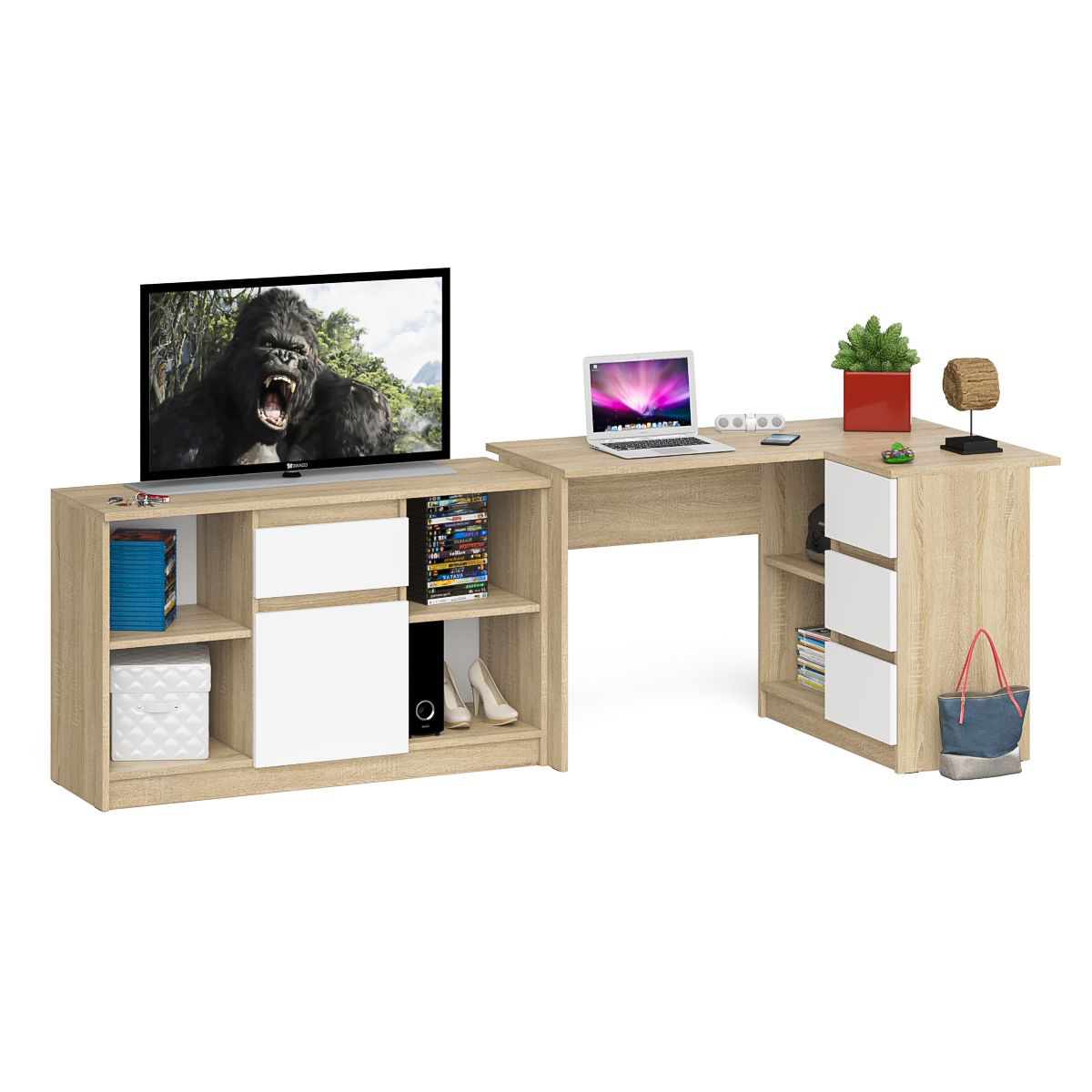 Комплектация включает стол компьютерный Мори МС-16 правый и тумбу ТВ Мори МТВ1204.1. Продуманная конструкция позволяет убрать лишние предметы, тем самым сохраняя единый стиль оформления помещения. Роль ручек выполняют сами фасады. Угловой компьютерный стол Мори МС-16 правый - конструктивно тумба со столешницей образуют угол. Тумба имеет 3 выдвижных ящика и нишу с полкой по середине. Угловой компьютерный стол Мори МС-16 правый не универсален при сборке - тумба с ящиками располагается справа. Тумба ТВ Мори МТВ1204.1 состоит из двух открытых ниш по бокам и ящика и закрытой нишей по центру. Все ниши имеет полочку по середине. На тумбе достаточно места для размещения телевизора дигональю 47 дюймов. Можно использовать как ТВ тумбу, так и обычную для хранения и размещения Ваших вещей.