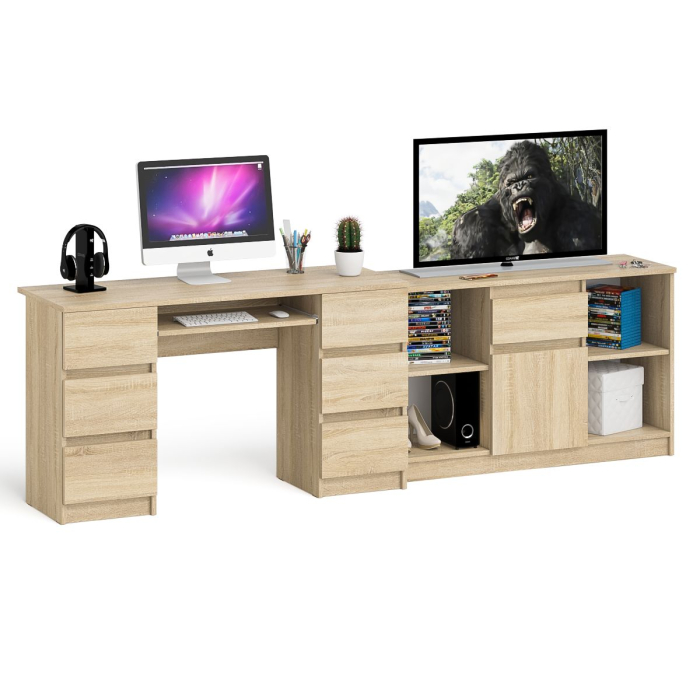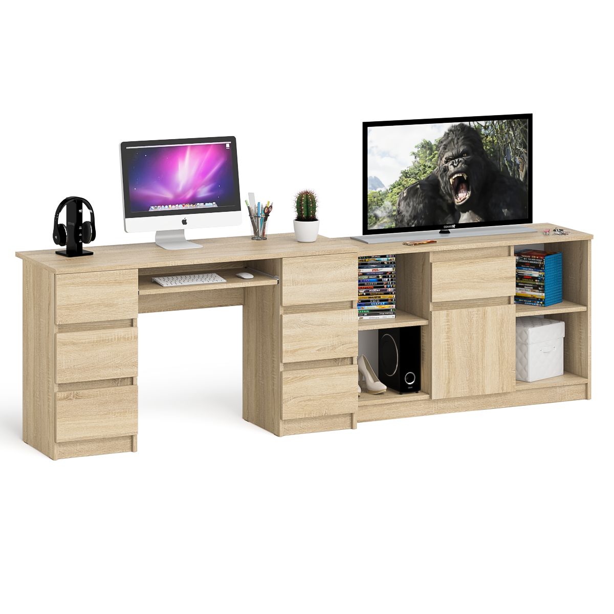 Комплектация включает компьютерный стол Мори МС-2 и тумбу ТВ Мори МТВ1204.1. Продуманная конструкция позволяет убрать лишние предметы, тем самым сохраняя единый стиль оформления помещения. Роль ручек выполняют сами фасады. Стол с 2 тумбами оборудован 6 ящиками и выдвижной полкой для клавиатуры. Под столешницей по бокам расположены две тумбы с тремя выдвижными ящиками в каждой. Тумба ТВ Мори МТВ1204.1 состоит из двух открытых ниш по бокам и ящика и закрытой нишей по центру. Все ниши имеет полочку по середине. На тумбе достаточно места для размещения телевизора дигональю 47 дюймов. Можно использовать как ТВ тумбу, так и обычную для хранения и размещения Ваших вещей.