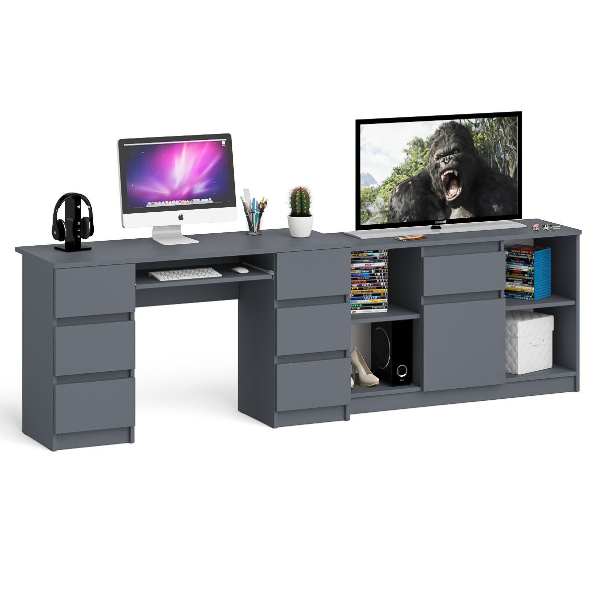 Комплектация включает компьютерный стол Мори МС-2 и тумбу ТВ Мори МТВ1204.1. Продуманная конструкция позволяет убрать лишние предметы, тем самым сохраняя единый стиль оформления помещения. Роль ручек выполняют сами фасады. Стол с 2 тумбами оборудован 6 ящиками и выдвижной полкой для клавиатуры. Под столешницей по бокам расположены две тумбы с тремя выдвижными ящиками в каждой. Тумба ТВ Мори МТВ1204.1 состоит из двух открытых ниш по бокам и ящика и закрытой нишей по центру. Все ниши имеет полочку по середине. На тумбе достаточно места для размещения телевизора дигональю 47 дюймов. Можно использовать как ТВ тумбу, так и обычную для хранения и размещения Ваших вещей.