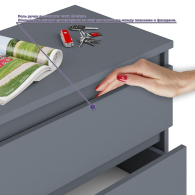 Открывание ящиков и двери производится за счет пространства между планками и фасадами. Выдвижные ящики на роликовых направляющих L=350 мм неполного выдвижения обеспечивают комфортную эксплуатацию. На нижних кромках опор предусмотрены пластиковые подпятники для защиты поверхности пола от механических повреждений. Поставляется в разобранном виде в надёжной упаковке, с комплектом сборочной фурнитуры и инструкцией по сборке.