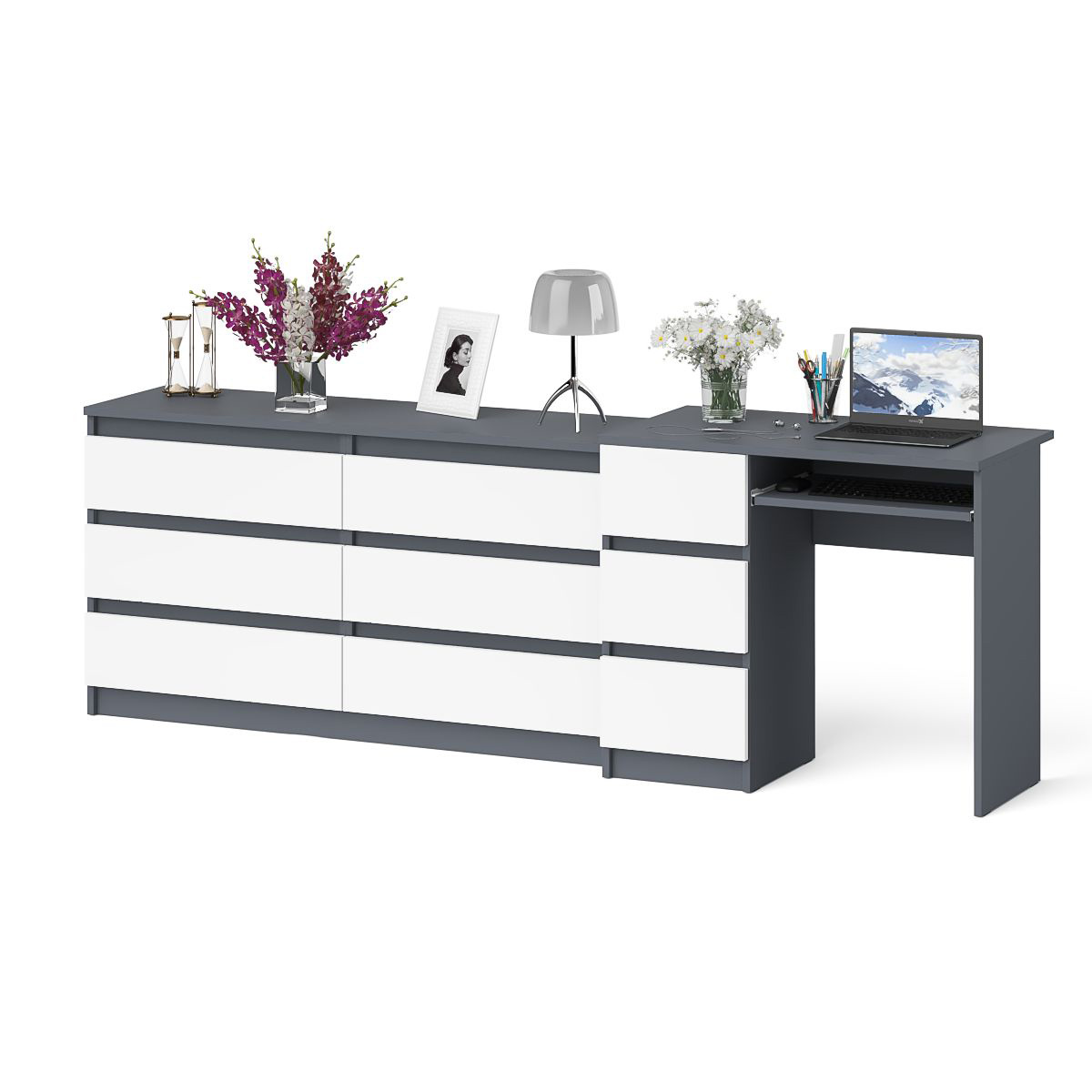 Широкий комод Мори МК1380.6 и стол компьютерный МС-6 три ящика слева (Графит/Белый) Код I0000381849