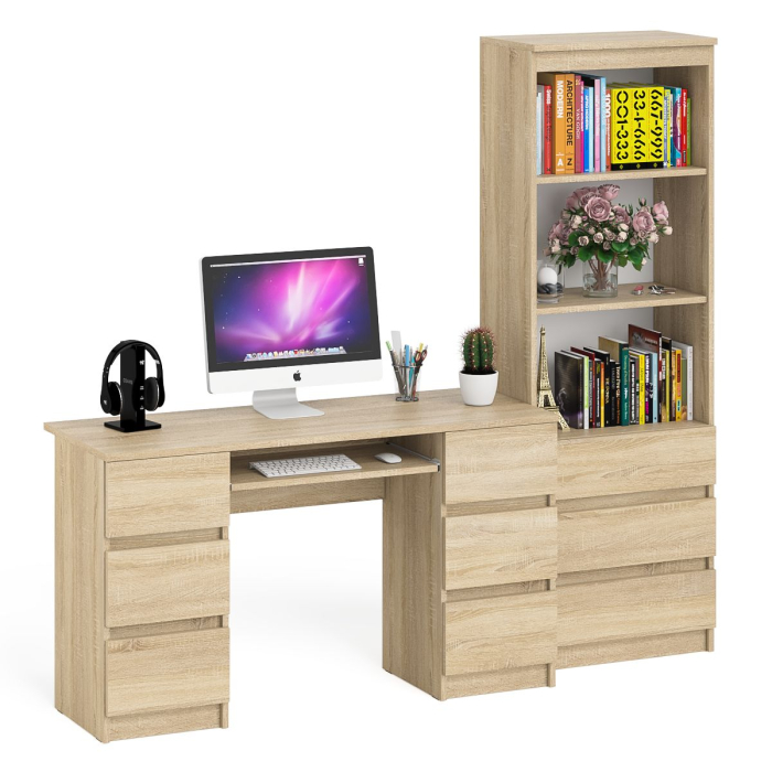 Комплектация включает компьютерный стол Мори МС-2 и стеллаж с ящиками Мори МСТ600. Продуманная конструкция позволяет убрать лишние предметы, тем самым сохраняя единый стиль оформления помещения. Роль ручек выполняют сами фасады. Стол с 2 тумбами оборудован 6 ящиками и выдвижной полкой для клавиатуры. Под столешницей по бокам расположены две тумбы с тремя выдвижными ящиками в каждой. Стеллаж Мори МСТ600 с двумя открытыми полками сверху и тремя выдвижными ящиками снизу.