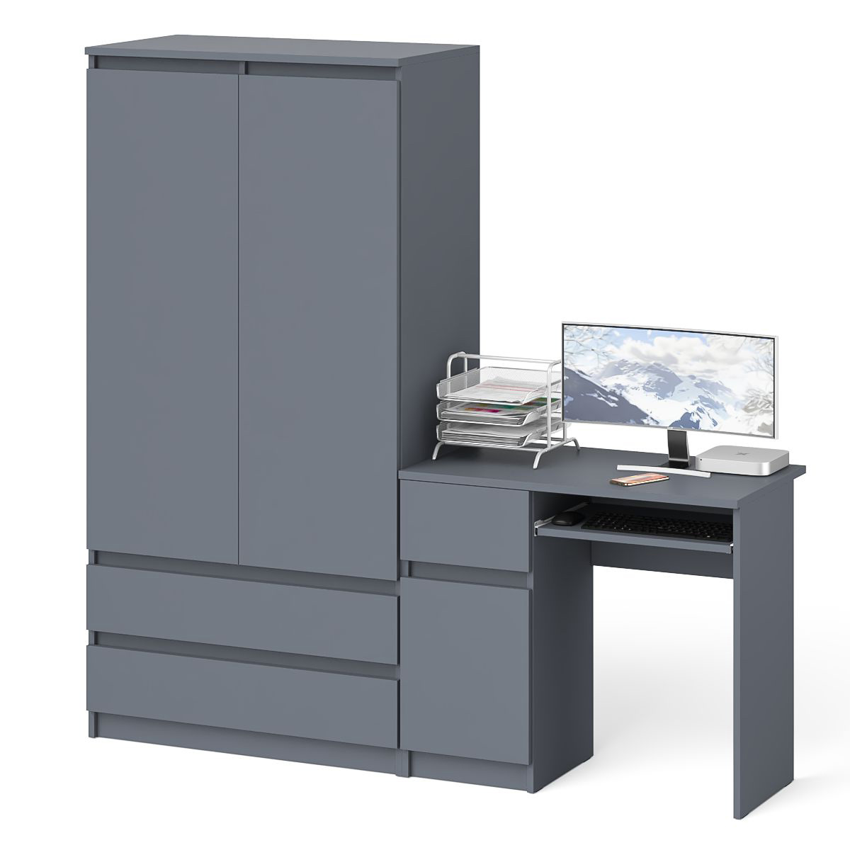 Комплектация включает стол компьютерный Мори МС-1 левый и шкаф-комод Мори МШ900.1. Продуманная конструкция позволяет убрать лишние предметы, тем самым сохраняя единый стиль оформления помещения. Роль ручек выполняют сами фасады. Небольшой стол компьютерный Мори МС-1 левый с тумбой и выдвижной панелью для клавиатуры. Тумба имеет нишу с полочкой за распашной дверкой и выдвижной ящик на роликовых направляющих. Стол компьютерный Мори МС-1 левый не имеет универсальной сборки - выдвижной ящик расположен слева. Шкаф-комод Мори МШ900.1 оборудован двумя распашными дверями сверху и двумя выдвижными ящиками снизу. За дверями расположены два отделения с одной стороны с горизонтальной штангой (420 мм.) для одежды на плечиках, с другой с тремя полками.
