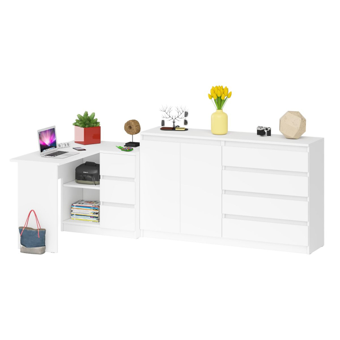 Комплектация включает стол компьютерный Мори МС-16 правый и комод Мори МК1600.1. Продуманная конструкция позволяет убрать лишние предметы, тем самым сохраняя единый стиль оформления помещения. Роль ручек выполняют сами фасады. Угловой компьютерный стол Мори МС-16 правый - конструктивно тумба со столешницей образуют угол. Тумба имеет 3 выдвижных ящика и нишу с полкой по середине. Угловой компьютерный стол Мори МС-16 правый не универсален при сборке - тумба с ящиками располагается справа. Широкий Мори МК1600.1 комод оборудован четырьмя выдвижными ящиками с одной стороны и закрытым отделением с полкой за двумя распашными дверками. Комод не имеет универсальной сборки - ящики расположены справа.
