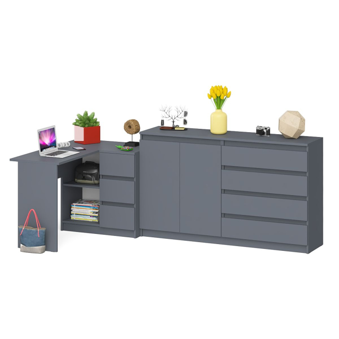 Комплектация включает стол компьютерный Мори МС-16 правый и комод Мори МК1600.1. Продуманная конструкция позволяет убрать лишние предметы, тем самым сохраняя единый стиль оформления помещения. Роль ручек выполняют сами фасады. Угловой компьютерный стол Мори МС-16 правый - конструктивно тумба со столешницей образуют угол. Тумба имеет 3 выдвижных ящика и нишу с полкой по середине. Угловой компьютерный стол Мори МС-16 правый не универсален при сборке - тумба с ящиками располагается справа. Широкий Мори МК1600.1 комод оборудован четырьмя выдвижными ящиками с одной стороны и закрытым отделением с полкой за двумя распашными дверками. Комод не имеет универсальной сборки - ящики расположены справа.