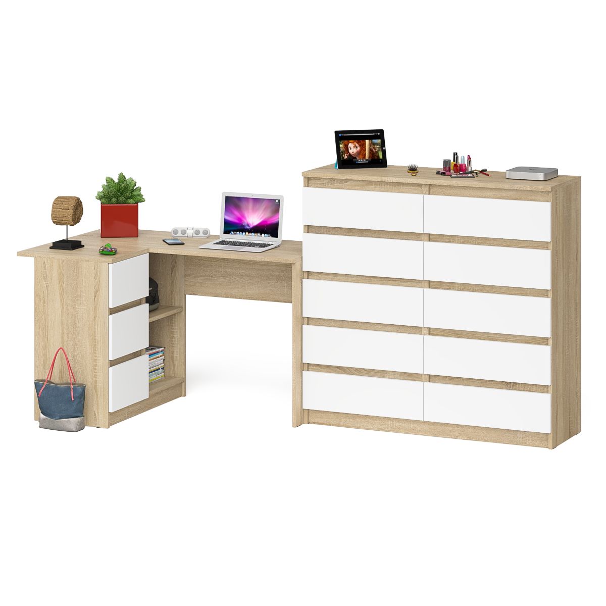 Отзывы о Столплит Компьютерный стол угловой МС-16 с тумбой слева с высоким комодом 10-ть ящиков Мори Дуб Сонома, Белый