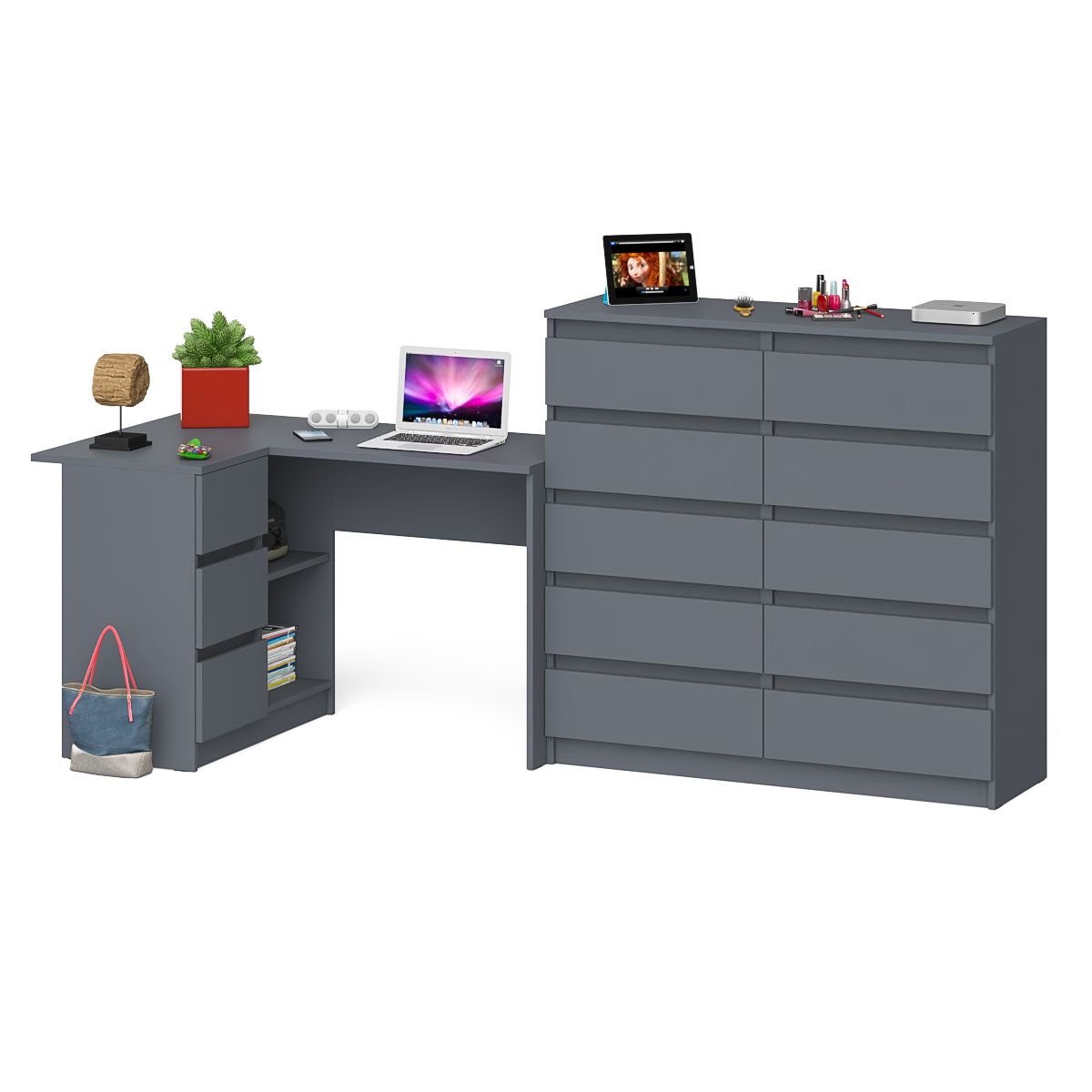 Компьютерный стол угловой МС-16 с тумбой слева с высоким комодом 10-ть ящиков Мори - минималистичный дизайн и доступная цена позволяет наслаждаться качественной и современной мебелью без значительных финансовых затрат!