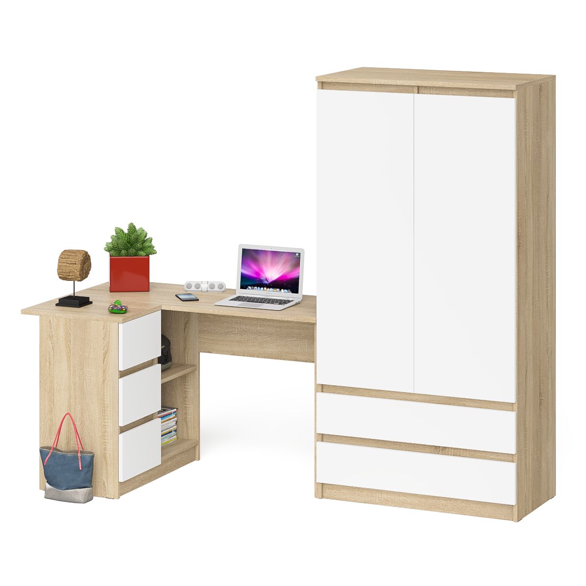 Открывание ящиков и дверей производится за счет пространства между планками и фасадами. Выдвижные ящики на роликовых направляющих (стола L=350 мм, шкафа L=400 мм) неполного выдвижения обеспечивают комфортную эксплуатацию. На нижних кромках опор предусмотрены пластиковые подпятники для защиты поверхности пола от механических повреждений. Поставляется в разобранном виде в надёжной упаковке, с комплектом сборочной фурнитуры и инструкцией по сборке.