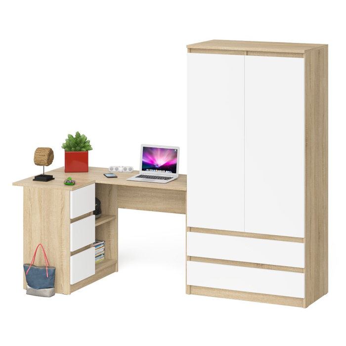 Комплектация включает стол компьютерный Мори МС-16 правый и шкаф-комод Мори МШ900.1. Продуманная конструкция позволяет убрать лишние предметы, тем самым сохраняя единый стиль оформления помещения. Роль ручек выполняют сами фасады. Угловой компьютерный стол Мори МС-16 правый - конструктивно тумба со столешницей образуют угол. Тумба имеет 3 выдвижных ящика и нишу с полкой по середине. Угловой компьютерный стол Мори МС-16 правый не универсален при сборке - тумба с ящиками располагается справа. Шкаф-комод Мори МШ900.1 оборудован двумя распашными дверями сверху и двумя выдвижными ящиками снизу. За дверями расположены два отделения с одной стороны с горизонтальной штангой (420 мм.) для одежды на плечиках, с другой с тремя полками.