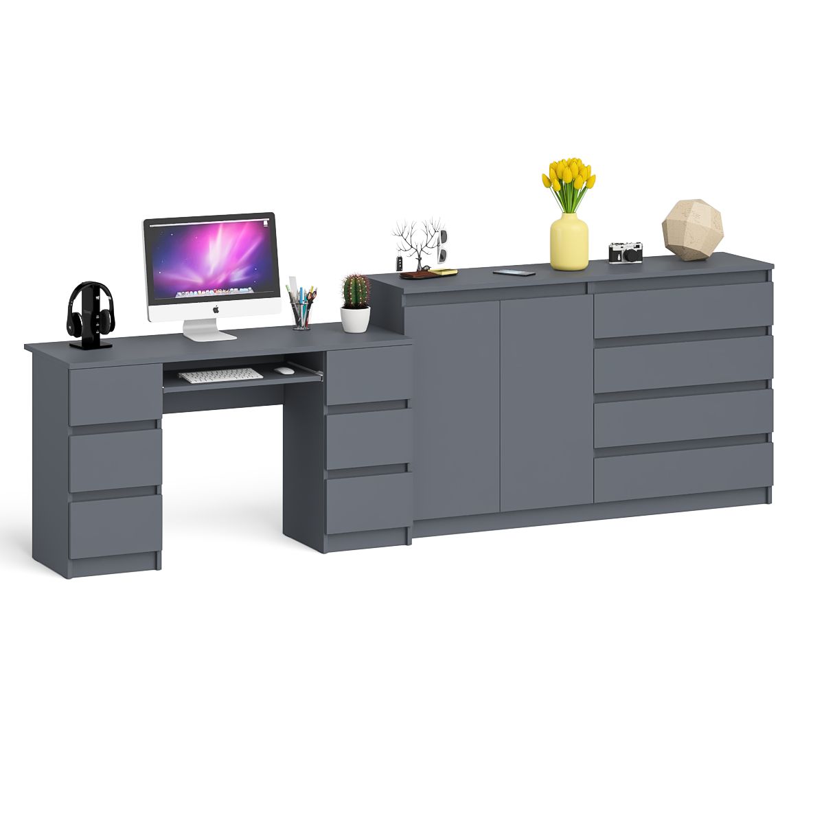 Комплектация включает компьютерный стол Мори МС-2 и комод Мори МК1600.1. Продуманная конструкция позволяет убрать лишние предметы, тем самым сохраняя единый стиль оформления помещения. Роль ручек выполняют сами фасады. Стол с 2 тумбами оборудован 6 ящиками и выдвижной полкой для клавиатуры. Под столешницей по бокам расположены две тумбы с тремя выдвижными ящиками в каждой. Широкий Мори МК1600.1 комод оборудован четырьмя выдвижными ящиками с одной стороны и закрытым отделением с полкой за двумя распашными дверками. Комод не имеет универсальной сборки - ящики расположены справа.