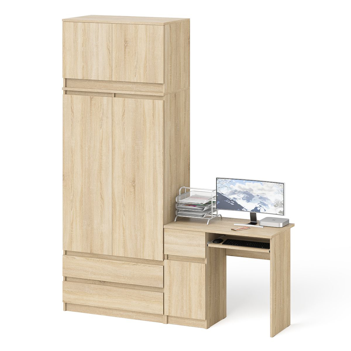 Комплектация включает стол компьютерный Мори МС-1 левый , шкаф-комод Мори МШ900.1 и антресоль Мори МА900.1. Продуманная конструкция позволяет убрать лишние предметы, тем самым сохраняя единый стиль оформления помещения. Роль ручек выполняют сами фасады. Небольшой стол компьютерный Мори МС-1 левый с тумбой и выдвижной панелью для клавиатуры. Тумба имеет нишу с полочкой за распашной дверкой и выдвижной ящик на роликовых направляющих. Стол компьютерный Мори МС-1 левый не имеет универсальной сборки - выдвижной ящик расположен слева. Шкаф-комод Мори МШ900.1 оборудован двумя распашными дверями сверху и двумя выдвижными ящиками снизу. За дверями расположены два отделения с одной стороны с горизонтальной штангой (420 мм.) для одежды на плечиках, с другой с тремя полками. За распашными дверками антресоли Мори МА900.1 расположена полка по центру, что позволяет убрать лишние предметы, тем самым сохраняя единый стиль оформления помещения.