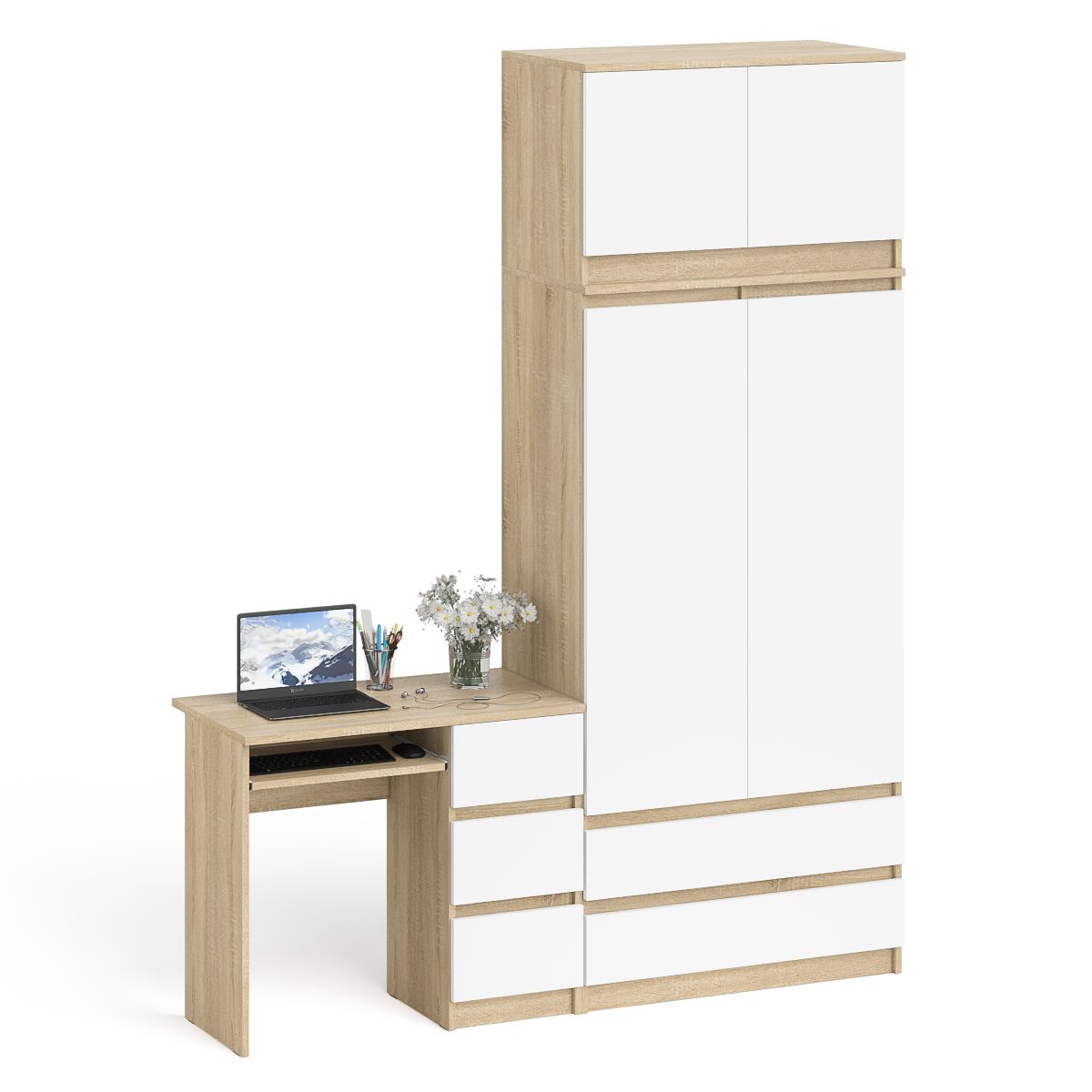 Открывание ящиков и дверей производится за счет пространства между планками и фасадами, дверей антресоли - за счет системы «Push-to-open». Выдвижные ящики на роликовых направляющих (стола L=350 мм, шкафа L=400 мм) неполного выдвижения обеспечивают комфортную эксплуатацию. На нижних кромках опор предусмотрены пластиковые подпятники для защиты поверхности пола от механических повреждений. Поставляется в разобранном виде в надёжной упаковке, с комплектом сборочной фурнитуры и инструкцией по сборке.