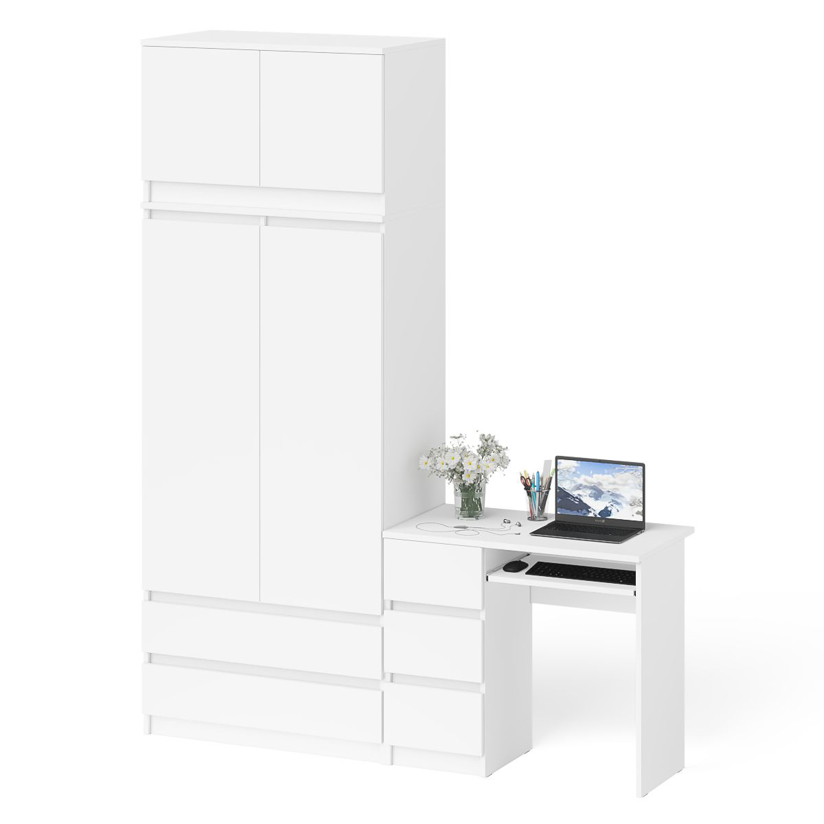 Открывание ящиков и дверей производится за счет пространства между планками и фасадами, дверей антресоли - за счет системы «Push-to-open». Выдвижные ящики на роликовых направляющих (стола L=350 мм, шкафа L=400 мм) неполного выдвижения обеспечивают комфортную эксплуатацию. На нижних кромках опор предусмотрены пластиковые подпятники для защиты поверхности пола от механических повреждений. Поставляется в разобранном виде в надёжной упаковке, с комплектом сборочной фурнитуры и инструкцией по сборке.