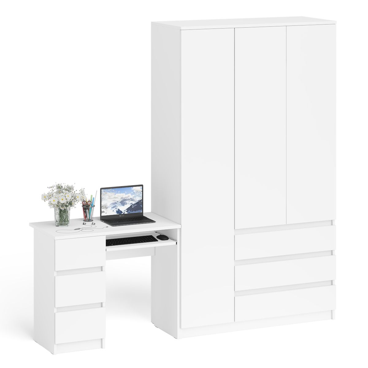 Комплектация включает стол компьютерный Мори МС-6 левый и широкий шкаф-комод Мори МШ1200.1. Продуманная конструкция позволяет убрать лишние предметы, тем самым сохраняя единый стиль оформления помещения. Роль ручек выполняют сами фасады. Небольшой Стол Мори МС-6 левый компьютерный с тумбой и выдвижной панелью для клавиатуры. Тумба имеет три выдвижных ящика на роликовых направляющих. Стол компьютерный три ящика Мори МС-6 левый не имеет универсальной сборки - выдвижной ящик расположен слева. Широкий шкаф-комод Мори МШ1200.1 оборудован тремя распашными дверями и тремя выдвижными ящиками. Слева за дверкой расположено отделение с горизонтальной штангой (372 мм) для одежды на плечиках, антресольной полкой и нижней нишей. Справа сверху за дверьми отделение с тремя полками и снизу тремя выдвижными ящиками. Шкаф-комод не универсален при сборке - отделение с ящиками располагается только справа.