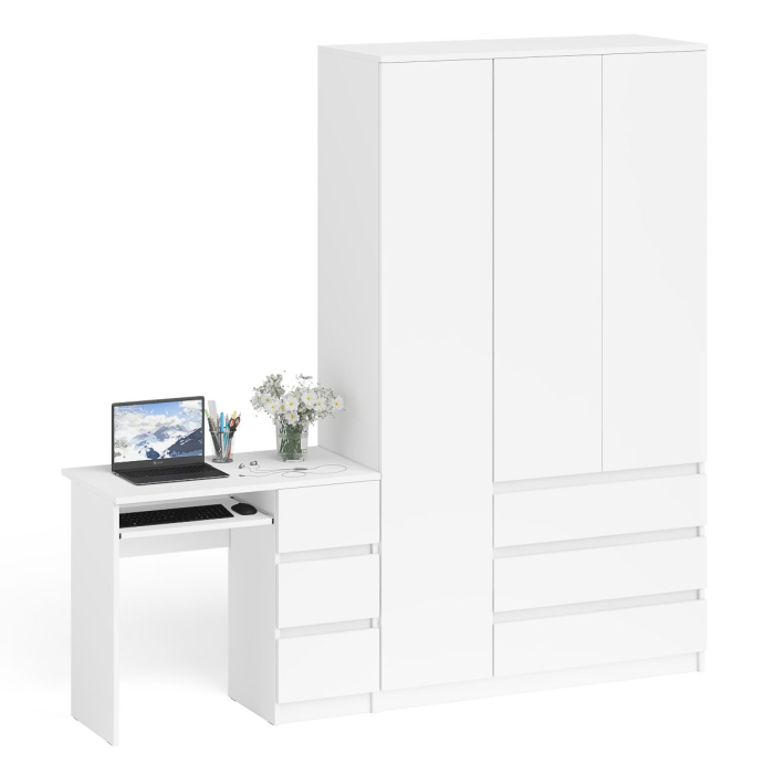 Открывание ящиков и малых дверей шкафа производится за счет пространства между планками и фасадами, высокой двери - за счет системы «Push-to-open». Выдвижные ящики на роликовых направляющих (стола L=350 мм, шкафа L=400 мм) неполного выдвижения обеспечивают комфортную эксплуатацию. На нижних кромках опор предусмотрены пластиковые подпятники для защиты поверхности пола от механических повреждений. Поставляется в разобранном виде в надёжной упаковке, с комплектом сборочной фурнитуры и инструкцией по сборке.