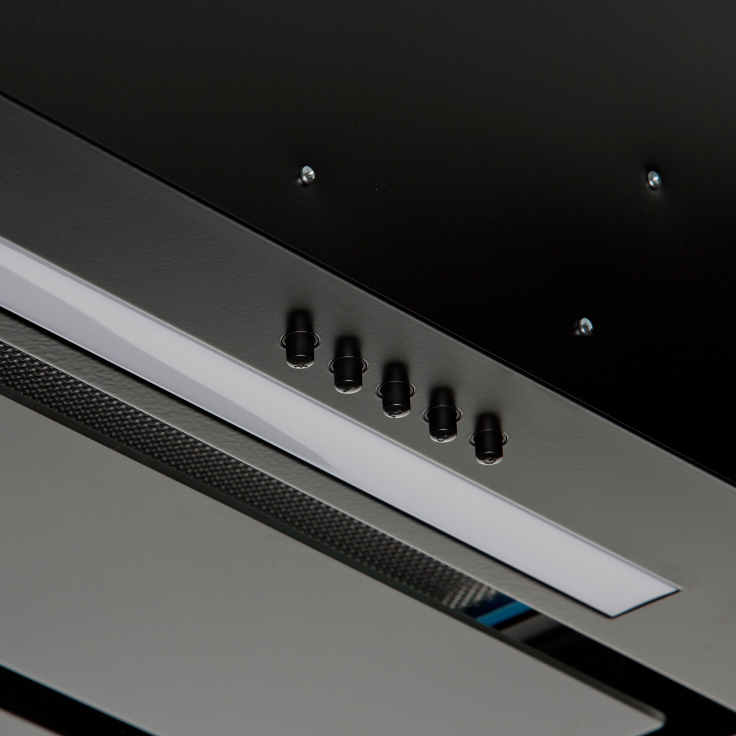 • Фасад вытяжки полностью закрывает нижнюю полку – это позволяет монтировать вытяжку в кухонные шкафчики вместо нижней полки (дна). Удобная система монтажа.