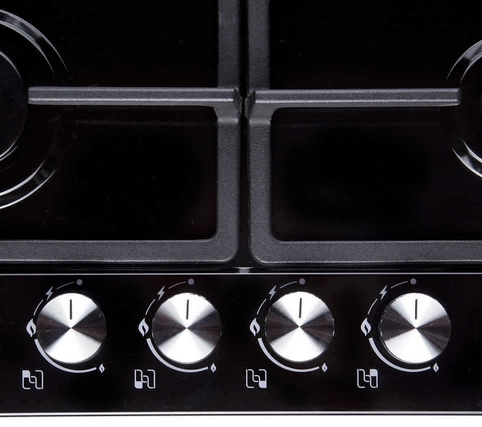 • Тяжелые цельнометаллические ручки управления с отделкой термостойким пластиком в цвете варочной панели