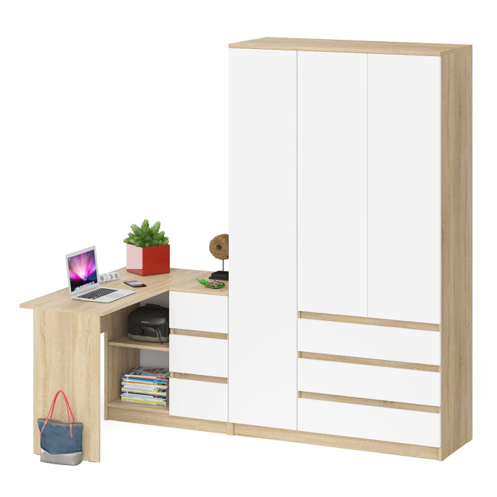 Комплектация включает стол компьютерный Мори МС-16 правый и широкий шкаф-комод Мори МШ1200.1. Продуманная конструкция позволяет убрать лишние предметы, тем самым сохраняя единый стиль оформления помещения. Роль ручек выполняют сами фасады. Угловой компьютерный стол Мори МС-16 правый - конструктивно тумба со столешницей образуют угол. Тумба имеет 3 выдвижных ящика и нишу с полкой по середине. Угловой компьютерный стол Мори МС-16 правый не универсален при сборке - тумба с ящиками располагается справа. Широкий шкаф-комод Мори МШ1200.1 оборудован тремя распашными дверями и тремя выдвижными ящиками. Слева за дверкой расположено отделение с горизонтальной штангой (372 мм) для одежды на плечиках, антресольной полкой и нижней нишей. Справа сверху за дверьми отделение с тремя полками и снизу тремя выдвижными ящиками. Шкаф-комод не универсален при сборке - отделение с ящиками располагается только справа.