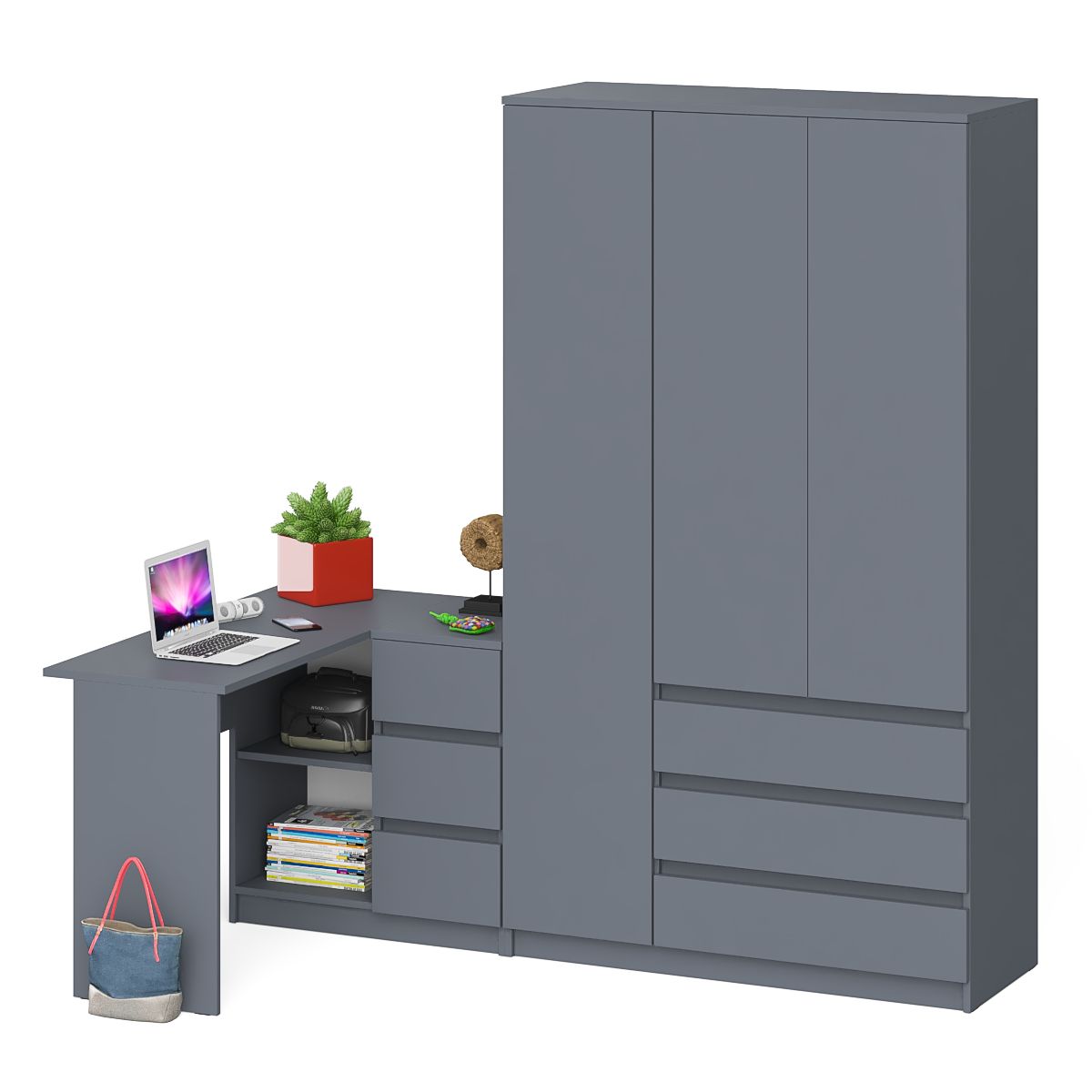 Комплектация включает стол компьютерный Мори МС-16 правый и широкий шкаф-комод Мори МШ1200.1. Продуманная конструкция позволяет убрать лишние предметы, тем самым сохраняя единый стиль оформления помещения. Роль ручек выполняют сами фасады. Угловой компьютерный стол Мори МС-16 правый - конструктивно тумба со столешницей образуют угол. Тумба имеет 3 выдвижных ящика и нишу с полкой по середине. Угловой компьютерный стол Мори МС-16 правый не универсален при сборке - тумба с ящиками располагается справа. Широкий шкаф-комод Мори МШ1200.1 оборудован тремя распашными дверями и тремя выдвижными ящиками. Слева за дверкой расположено отделение с горизонтальной штангой (372 мм) для одежды на плечиках, антресольной полкой и нижней нишей. Справа сверху за дверьми отделение с тремя полками и снизу тремя выдвижными ящиками. Шкаф-комод не универсален при сборке - отделение с ящиками располагается только справа.