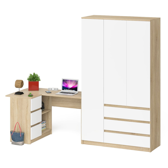 Комплектация включает стол компьютерный Мори МС-16 левый и широкий шкаф-комод Мори МШ1200.1. Продуманная конструкция позволяет убрать лишние предметы, тем самым сохраняя единый стиль оформления помещения. Роль ручек выполняют сами фасады. Угловой компьютерный стол Мори МС-16 левый - конструктивно тумба со столешницей образуют угол. Тумба имеет 3 выдвижных ящика и нишу с полкой по середине. Угловой компьютерный стол Мори МС-16 левый не универсален при сборке - тумба с ящиками располагается слева. Широкий шкаф-комод Мори МШ1200.1 оборудован тремя распашными дверями и тремя выдвижными ящиками. Слева за дверкой расположено отделение с горизонтальной штангой (372 мм) для одежды на плечиках, антресольной полкой и нижней нишей. Справа сверху за дверьми отделение с тремя полками и снизу тремя выдвижными ящиками. Шкаф-комод не универсален при сборке - отделение с ящиками располагается только справа.