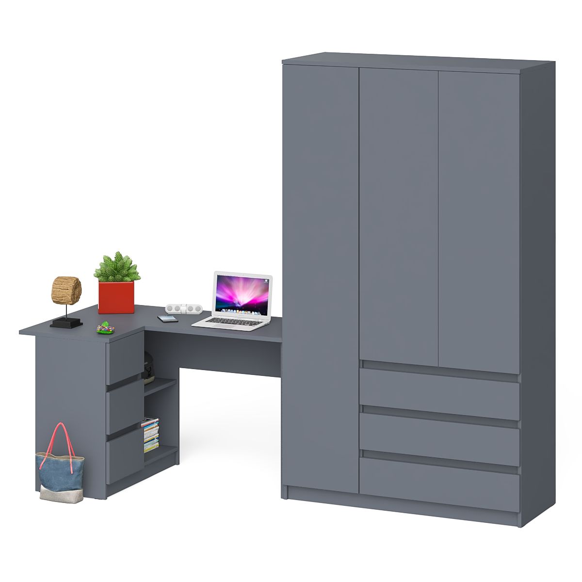 Комплектация включает стол компьютерный Мори МС-16 левый и широкий шкаф-комод Мори МШ1200.1. Продуманная конструкция позволяет убрать лишние предметы, тем самым сохраняя единый стиль оформления помещения. Роль ручек выполняют сами фасады. Угловой компьютерный стол Мори МС-16 левый - конструктивно тумба со столешницей образуют угол. Тумба имеет 3 выдвижных ящика и нишу с полкой по середине. Угловой компьютерный стол Мори МС-16 левый не универсален при сборке - тумба с ящиками располагается слева. Широкий шкаф-комод Мори МШ1200.1 оборудован тремя распашными дверями и тремя выдвижными ящиками. Слева за дверкой расположено отделение с горизонтальной штангой (372 мм) для одежды на плечиках, антресольной полкой и нижней нишей. Справа сверху за дверьми отделение с тремя полками и снизу тремя выдвижными ящиками. Шкаф-комод не универсален при сборке - отделение с ящиками располагается только справа.