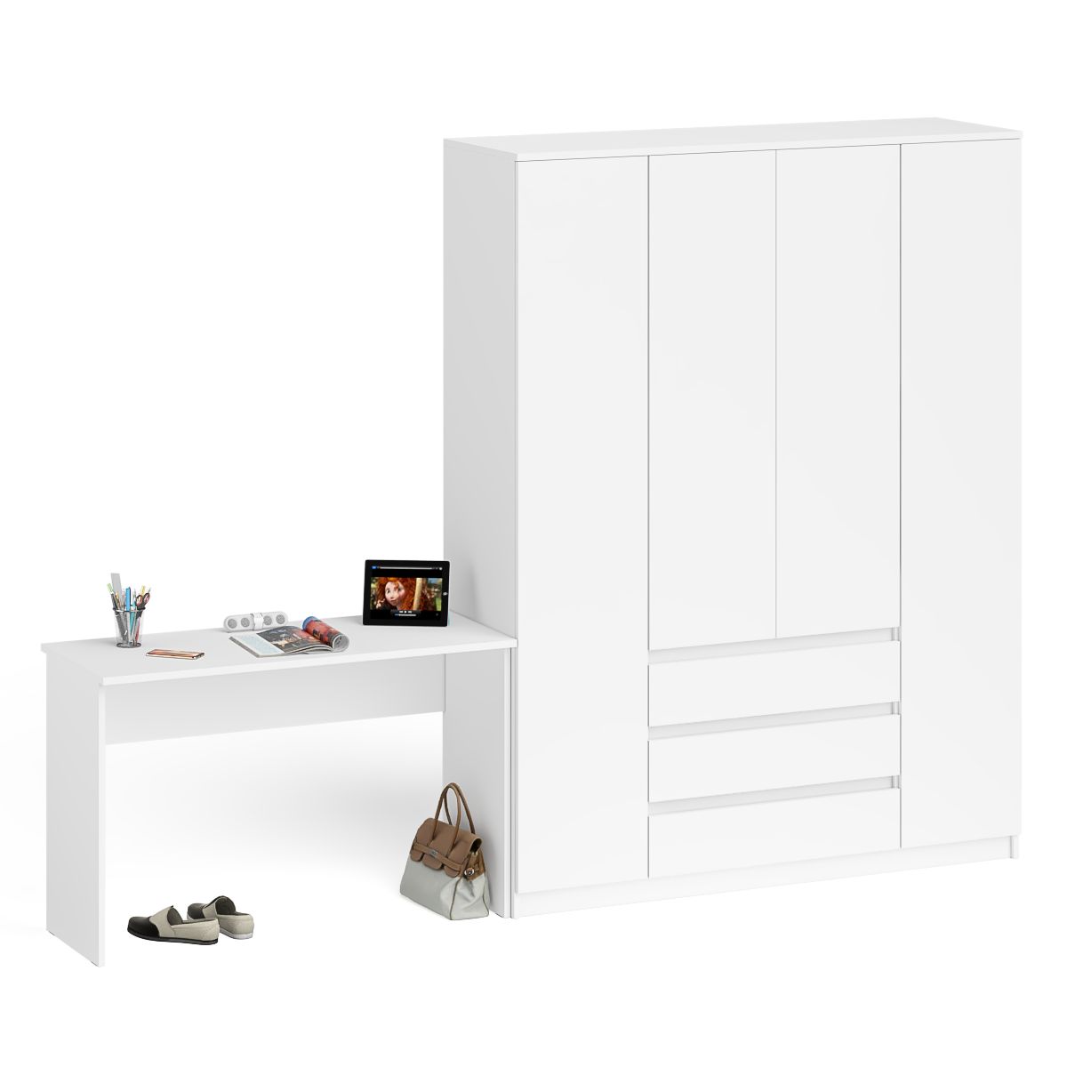 Комплектация включает стол письменный Мори МСП1200.1 и шкаф-комод Мори МШ1600.1. Продуманная конструкция позволяет убрать лишние предметы, тем самым сохраняя единый стиль оформления помещения. Роль ручек выполняют сами фасады. Стол письменный Мори МСП1200.1 - простой аккуратный стол без тумб и ящиков - минималистичный дизайн и доступная цена. Столещница размером 120х50 см. вместит все необходимые принадлежности для работы. По бокам располагаются две опоры из ЛДСП выполняющие роль ножек. С задней стороны стола имеется царга - верхняя соединительная планка между ножками. Шкаф-комод с тремя ящиками и четырьмя дверками Мори МШ1600.1 оборудован тремя отделениями. Центральное сверху за распашными дверьми с тремя полками и снизу тремя выдвижными ящиками. По бокам расположены два отделения с горизонтальными штангами (2х372 мм) для одежды на плечиках, антресольной полкой и нижней нишей в каждом.