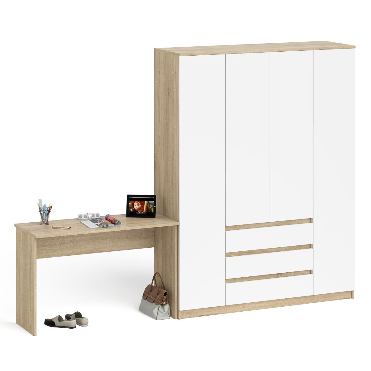 Комплектация включает стол письменный Мори МСП1200.1 и шкаф-комод Мори МШ1600.1. Продуманная конструкция позволяет убрать лишние предметы, тем самым сохраняя единый стиль оформления помещения. Роль ручек выполняют сами фасады. Стол письменный Мори МСП1200.1 - простой аккуратный стол без тумб и ящиков - минималистичный дизайн и доступная цена. Столещница размером 120х50 см. вместит все необходимые принадлежности для работы. По бокам располагаются две опоры из ЛДСП выполняющие роль ножек. С задней стороны стола имеется царга - верхняя соединительная планка между ножками. Шкаф-комод с тремя ящиками и четырьмя дверками Мори МШ1600.1 оборудован тремя отделениями. Центральное сверху за распашными дверьми с тремя полками и снизу тремя выдвижными ящиками. По бокам расположены два отделения с горизонтальными штангами (2х372 мм) для одежды на плечиках, антресольной полкой и нижней нишей в каждом.
