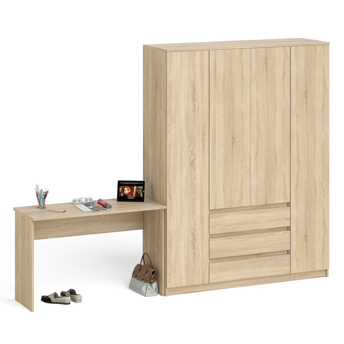 Комплектация включает стол письменный Мори МСП1200.1 и шкаф-комод Мори МШ1600.1. Продуманная конструкция позволяет убрать лишние предметы, тем самым сохраняя единый стиль оформления помещения. Роль ручек выполняют сами фасады. Стол письменный Мори МСП1200.1 - простой аккуратный стол без тумб и ящиков - минималистичный дизайн и доступная цена. Столещница размером 120х50 см. вместит все необходимые принадлежности для работы. По бокам располагаются две опоры из ЛДСП выполняющие роль ножек. С задней стороны стола имеется царга - верхняя соединительная планка между ножками. Шкаф-комод с тремя ящиками и четырьмя дверками Мори МШ1600.1 оборудован тремя отделениями. Центральное сверху за распашными дверьми с тремя полками и снизу тремя выдвижными ящиками. По бокам расположены два отделения с горизонтальными штангами (2х372 мм) для одежды на плечиках, антресольной полкой и нижней нишей в каждом.