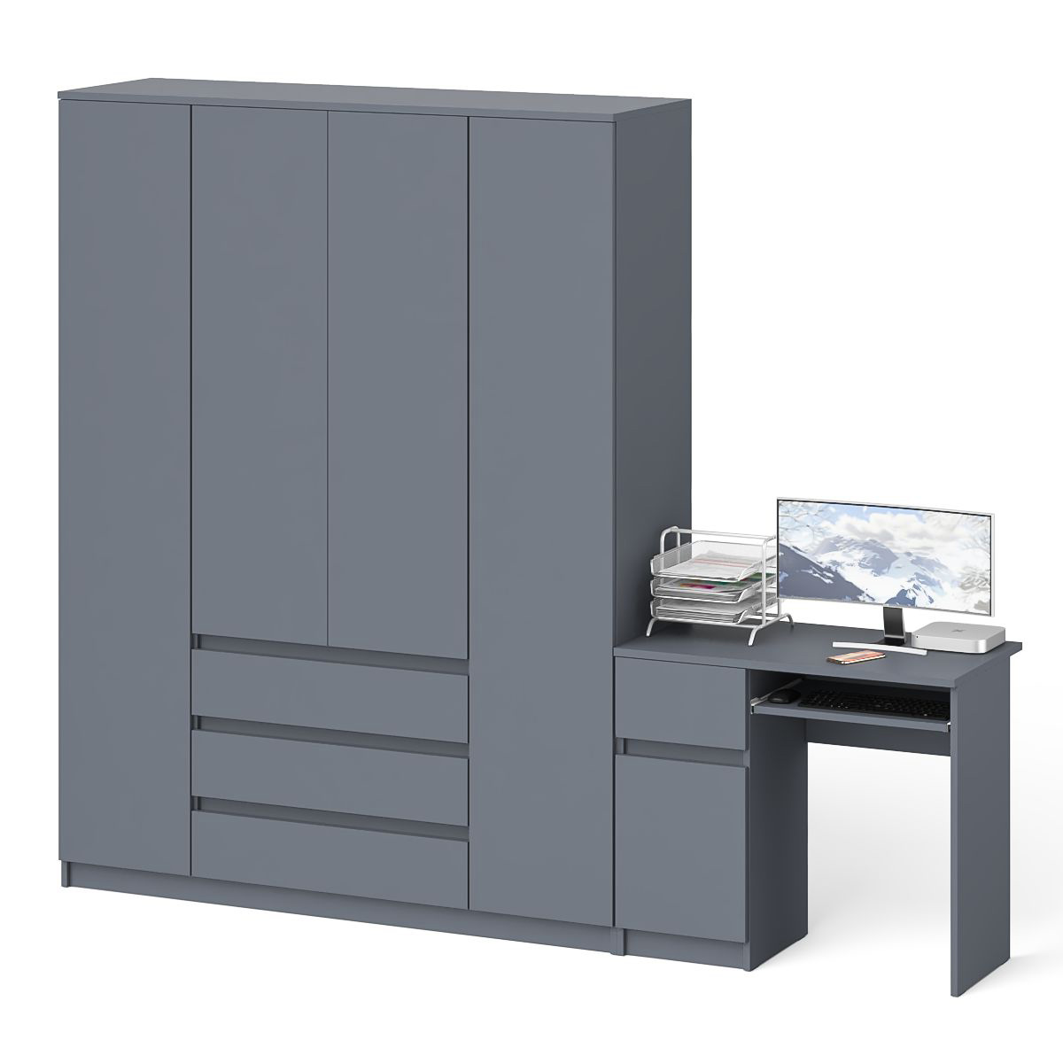 Комплектация включает стол компьютерный Мори МС-1 левый и шкаф-комод Мори МШ1600.1. Продуманная конструкция позволяет убрать лишние предметы, тем самым сохраняя единый стиль оформления помещения. Роль ручек выполняют сами фасады. Небольшой стол компьютерный Мори МС-1 левый с тумбой и выдвижной панелью для клавиатуры. Тумба имеет нишу с полочкой за распашной дверкой и выдвижной ящик на роликовых направляющих. Стол компьютерный Мори МС-1 левый не имеет универсальной сборки - выдвижной ящик расположен слева. Шкаф-комод с тремя ящиками и четырьмя дверками Мори МШ1600.1 оборудован тремя отделениями. Центральное сверху за распашными дверьми с тремя полками и снизу тремя выдвижными ящиками. По бокам расположены два отделения с горизонтальными штангами (2х372 мм) для одежды на плечиках, антресольной полкой и нижней нишей в каждом.