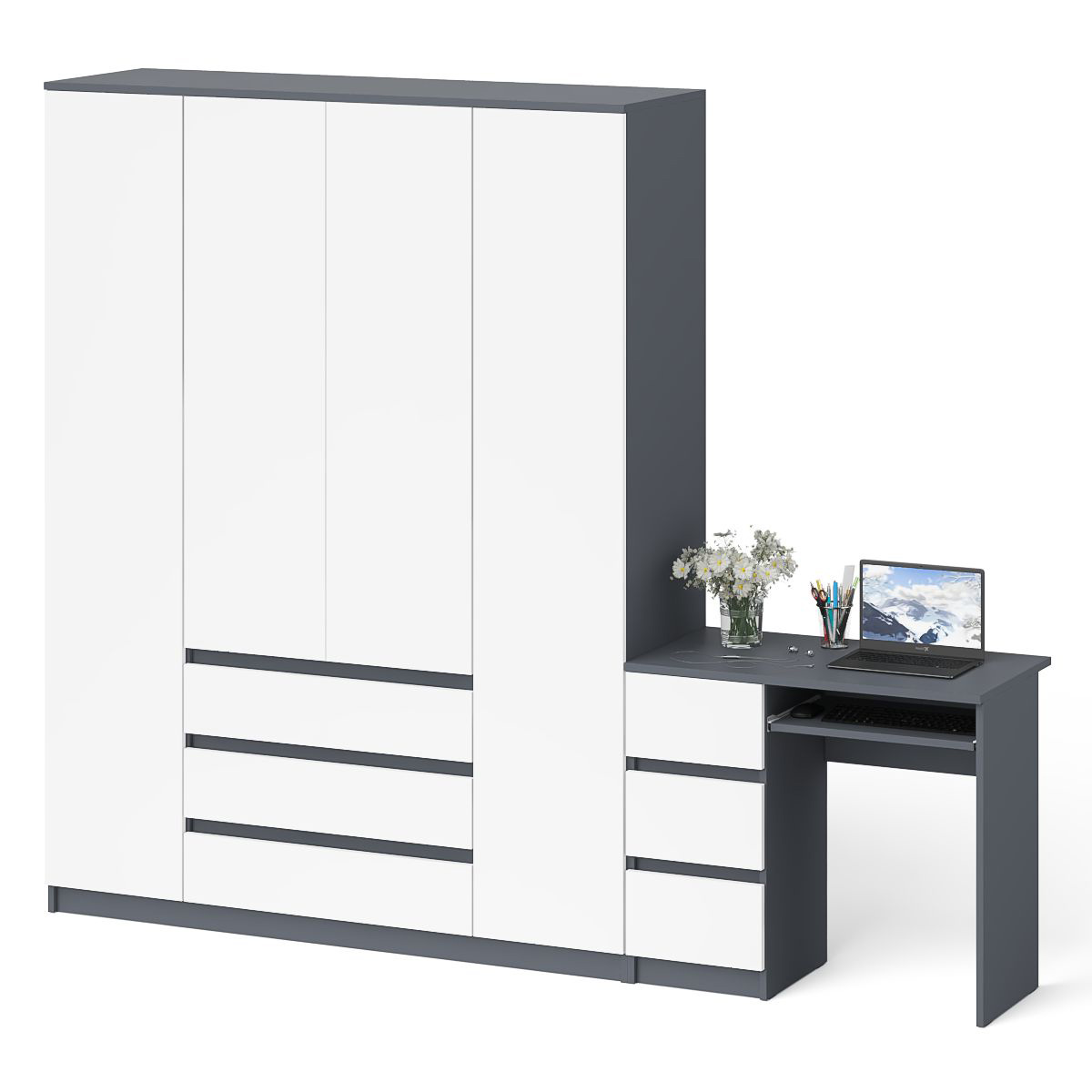 Открывание ящиков и малых дверей шкафа производится за счет пространства между планками и фасадами, высоких дверей - за счет системы «Push-to-open». Выдвижные ящики на роликовых направляющих (стола L=350 мм, шкафа L=400 мм) неполного выдвижения обеспечивают комфортную эксплуатацию. На нижних кромках опор предусмотрены пластиковые подпятники для защиты поверхности пола от механических повреждений. Поставляется в разобранном виде в надёжной упаковке, с комплектом сборочной фурнитуры и инструкцией по сборке.