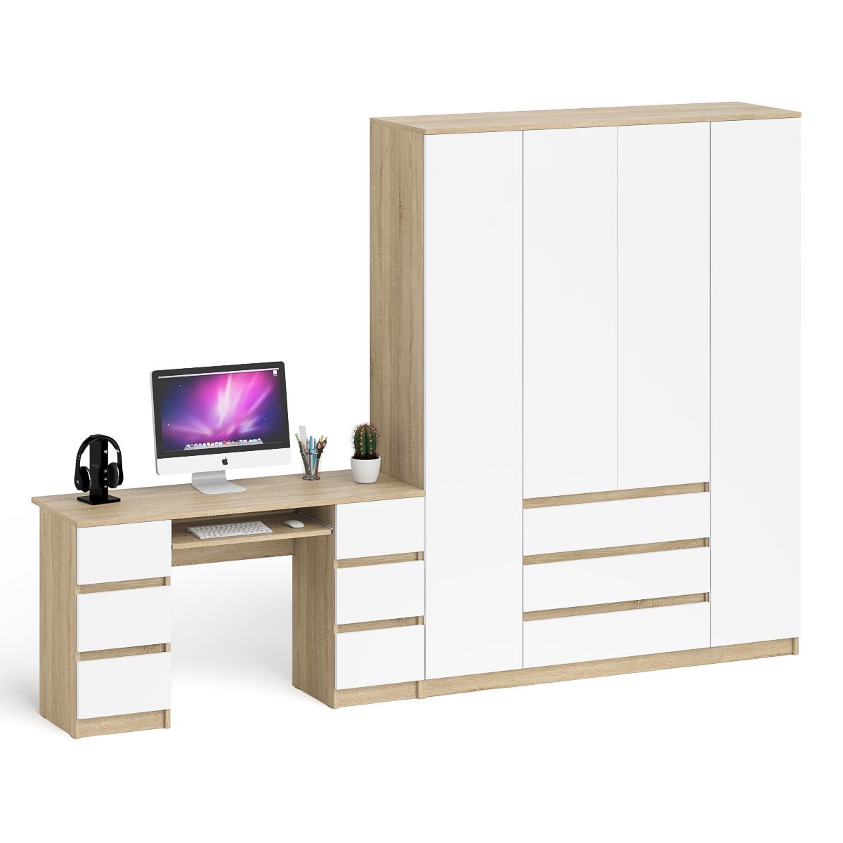 Комплектация включает компьютерный стол Мори МС-2 и шкаф-комод Мори МШ1600.1. Продуманная конструкция позволяет убрать лишние предметы, тем самым сохраняя единый стиль оформления помещения. Роль ручек выполняют сами фасады. Стол с 2 тумбами оборудован 6 ящиками и выдвижной полкой для клавиатуры. Под столешницей по бокам расположены две тумбы с тремя выдвижными ящиками в каждой. Шкаф-комод с тремя ящиками и четырьмя дверками Мори МШ1600.1 оборудован тремя отделениями. Центральное сверху за распашными дверьми с тремя полками и снизу тремя выдвижными ящиками. По бокам расположены два отделения с горизонтальными штангами (2х372 мм) для одежды на плечиках, антресольной полкой и нижней нишей в каждом.