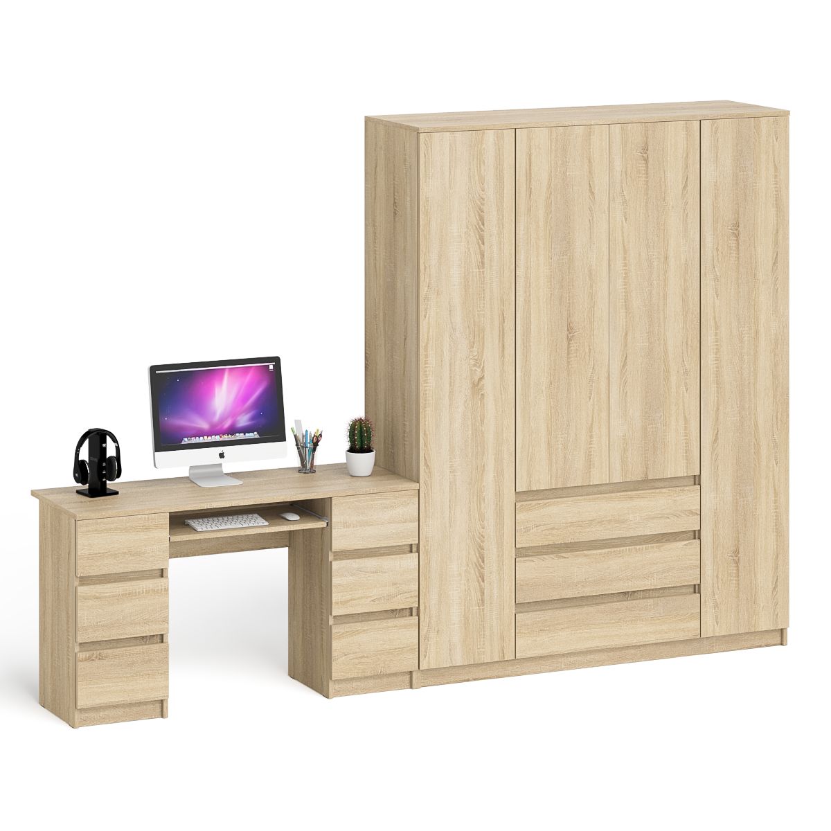 Комплектация включает компьютерный стол Мори МС-2 и шкаф-комод Мори МШ1600.1. Продуманная конструкция позволяет убрать лишние предметы, тем самым сохраняя единый стиль оформления помещения. Роль ручек выполняют сами фасады. Стол с 2 тумбами оборудован 6 ящиками и выдвижной полкой для клавиатуры. Под столешницей по бокам расположены две тумбы с тремя выдвижными ящиками в каждой. Шкаф-комод с тремя ящиками и четырьмя дверками Мори МШ1600.1 оборудован тремя отделениями. Центральное сверху за распашными дверьми с тремя полками и снизу тремя выдвижными ящиками. По бокам расположены два отделения с горизонтальными штангами (2х372 мм) для одежды на плечиках, антресольной полкой и нижней нишей в каждом.