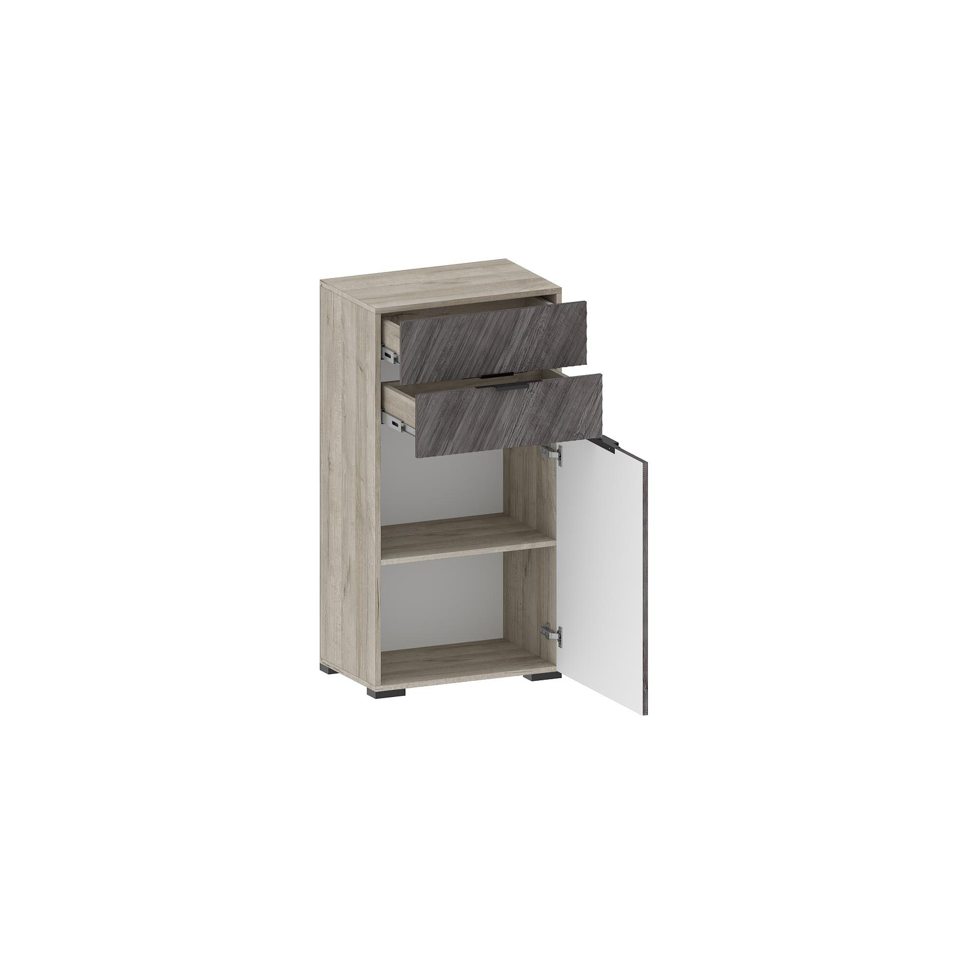 Новые современные цвета: черный ясень — это глубокий серый, легкий и одновременно динамичный цвет в сочетании с санторини белым — цвет с древесными линиями, создающими гармоничный контраст, наполняя пространство воздухом и природной энергией. Визуальная легкость, эстетика графики, элегантная окантовка с четкими формами, баланс теплых и холодных оттенков легли в основу дизайна новых модулей. Комоды и тумбы укомплектованы направляющими полного выдвижения. Строгая лаконичная ручка черного цвета. Крышки 32 мм.