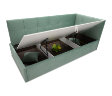Ее изделие выполнено из прочного ДСП, а для комфорта на верхней поверхности кровати используется ППУ, холлкон, спанбонд наполнитель.