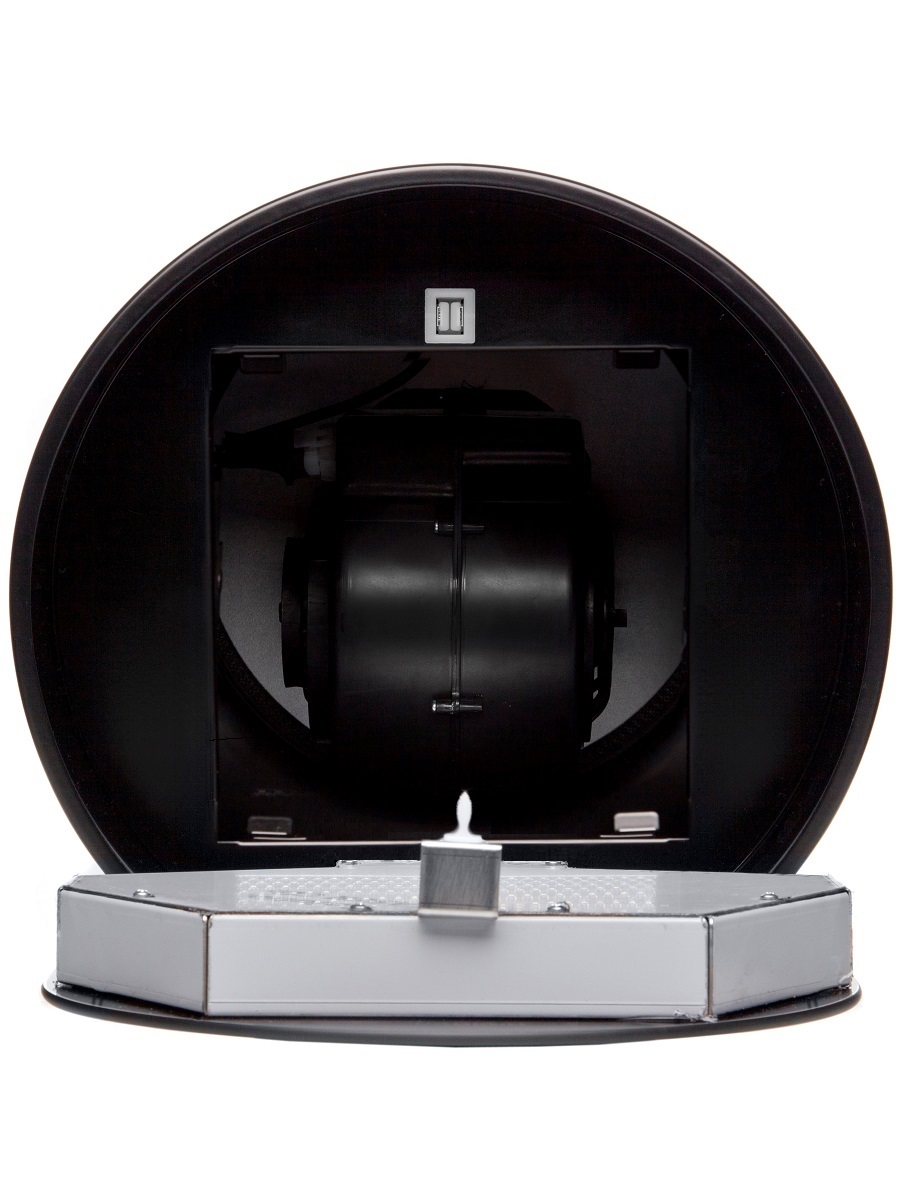 + Вытяжка выполнена в форме цилиндра. Геометрические формы повсеместно используется в современных дизайнерских проектах, они ассоциируются с простотой и лаконичностью, привносят в помещение гармонию и стиль. Стильное сочетание стали и блеска закаленного стекла создают ощущение легкости прочной конструкции. Декоративный стеклянный люк скрывает алюминиевый, жироулавливающий фильтр, придавая завершенность композиции