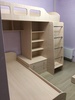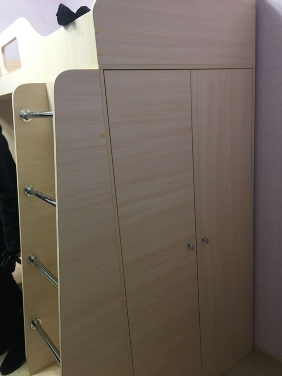 компактная, с большим количеством полок, ящиков, двухъярусная кровать, удобный встроенный шкаф для одежды.