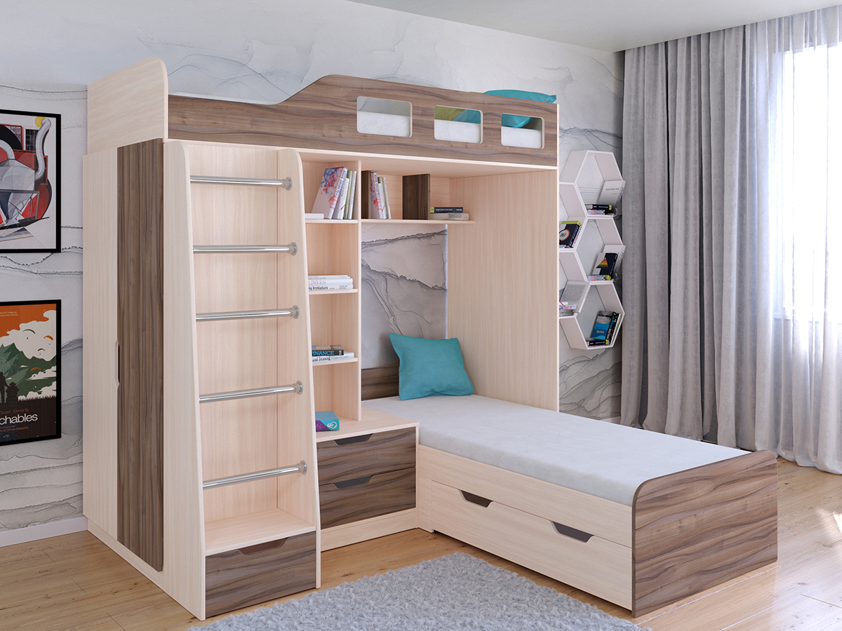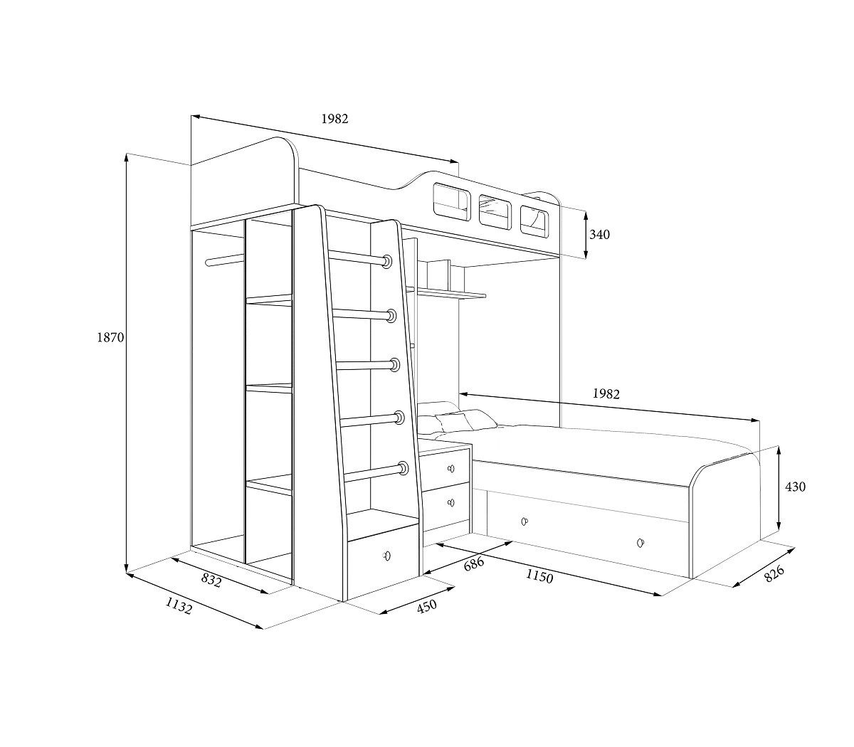 Двухъярусная кровать Астра 4 для двоих детей имеет необычную конфигурацию спальных мест. За счет этого она может быть гармонично расположена в углу комнаты. В изголовье расположились полочки для книг и игрушек. Рядом с нижней кроватью расположена удобная тумба с двумя ящиками, на которую можно поставить лампу для чтения. Нижняя кровать также снабжена вместительным выкатным ящиком для хранения игрушек или постельного белья. В боковой части всей конструкции есть встроенный шкаф для одежды.