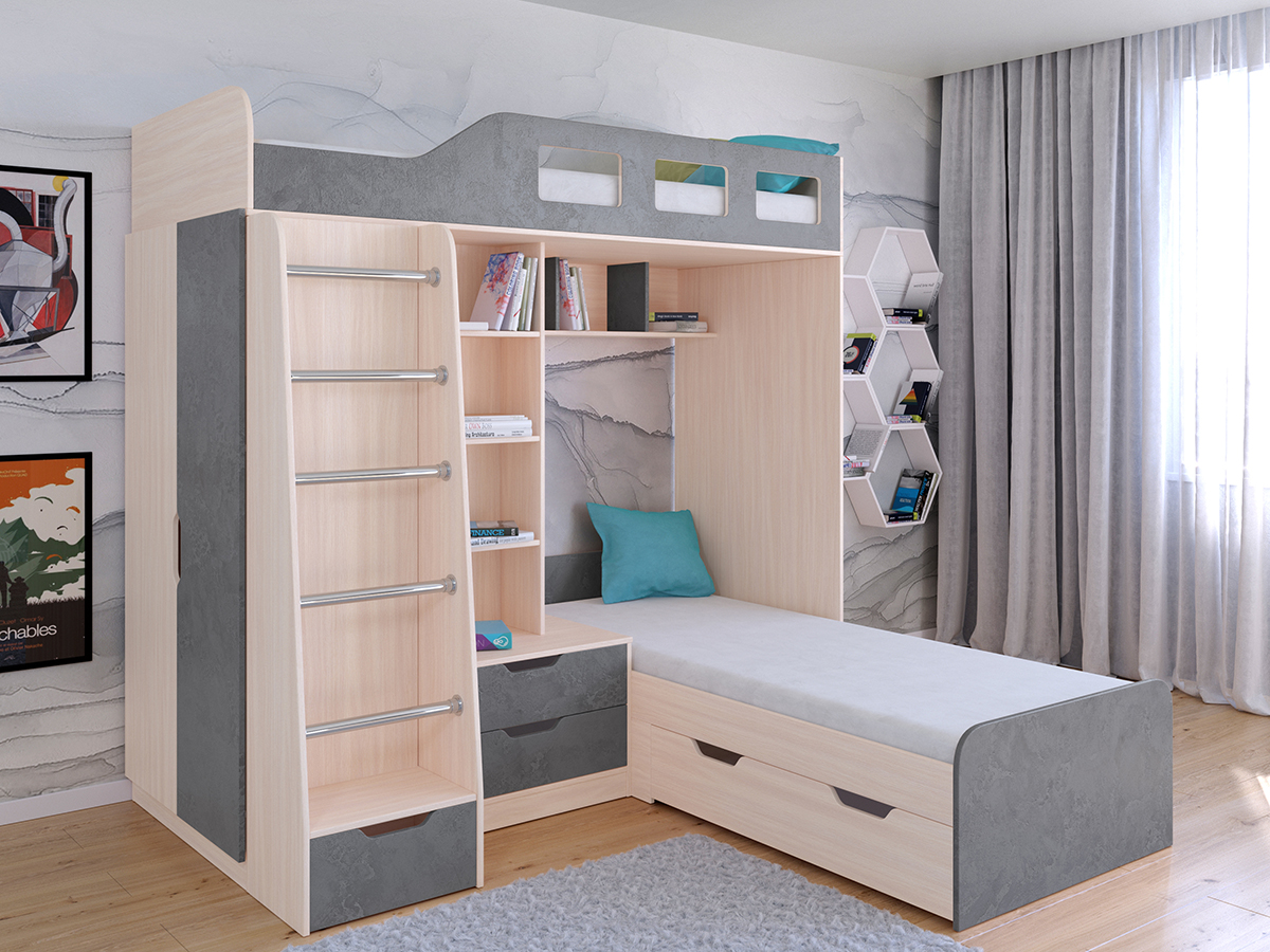 Двухъярусная кровать Астра 4 для двоих детей имеет необычную конфигурацию спальных мест. За счет этого она может быть гармонично расположена в углу комнаты. В изголовье расположились полочки для книг и игрушек. Рядом с нижней кроватью расположена удобная тумба с двумя ящиками, на которую можно поставить лампу для чтения. Нижняя кровать также снабжена вместительным выкатным ящиком для хранения игрушек или постельного белья. В боковой части всей конструкции есть встроенный шкаф для одежды.