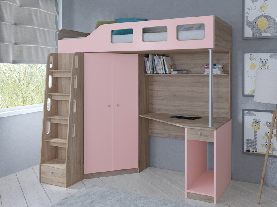 Кровать-чердак Астра 7 Дуб Сонома (Розовый)