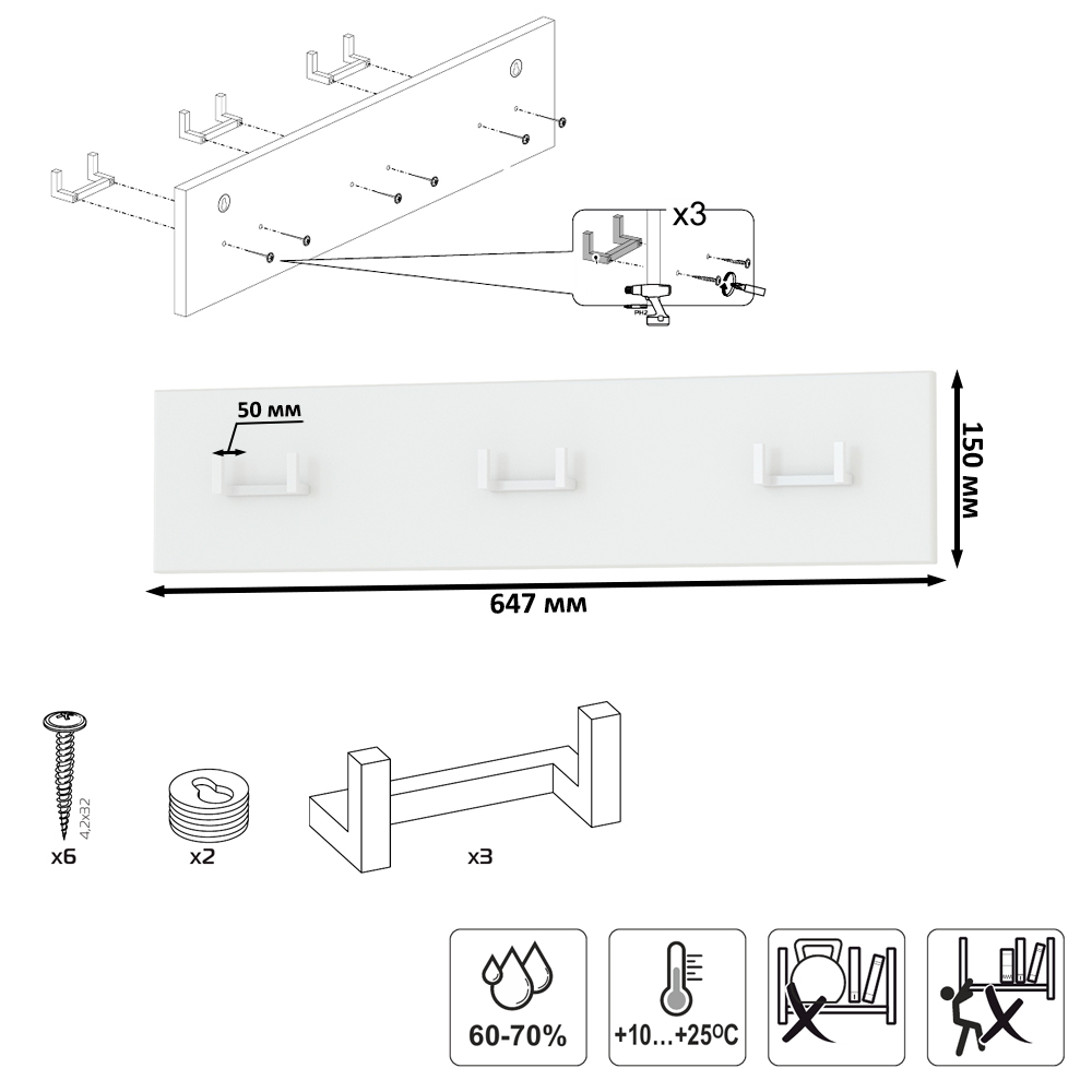 Настенная вешалка представляет из себя панель из МДФ с тремя двухрожковыми крючками. В комплекте вешалки имеются скрытые крепления к стене. Максимальная нагрузка на каждый крючок составляет 1,5 кг. Вешалка Октава 15.14.02 рассчитана для малогаборитных помещений (прихожих, балконов), по приемлемой цене.