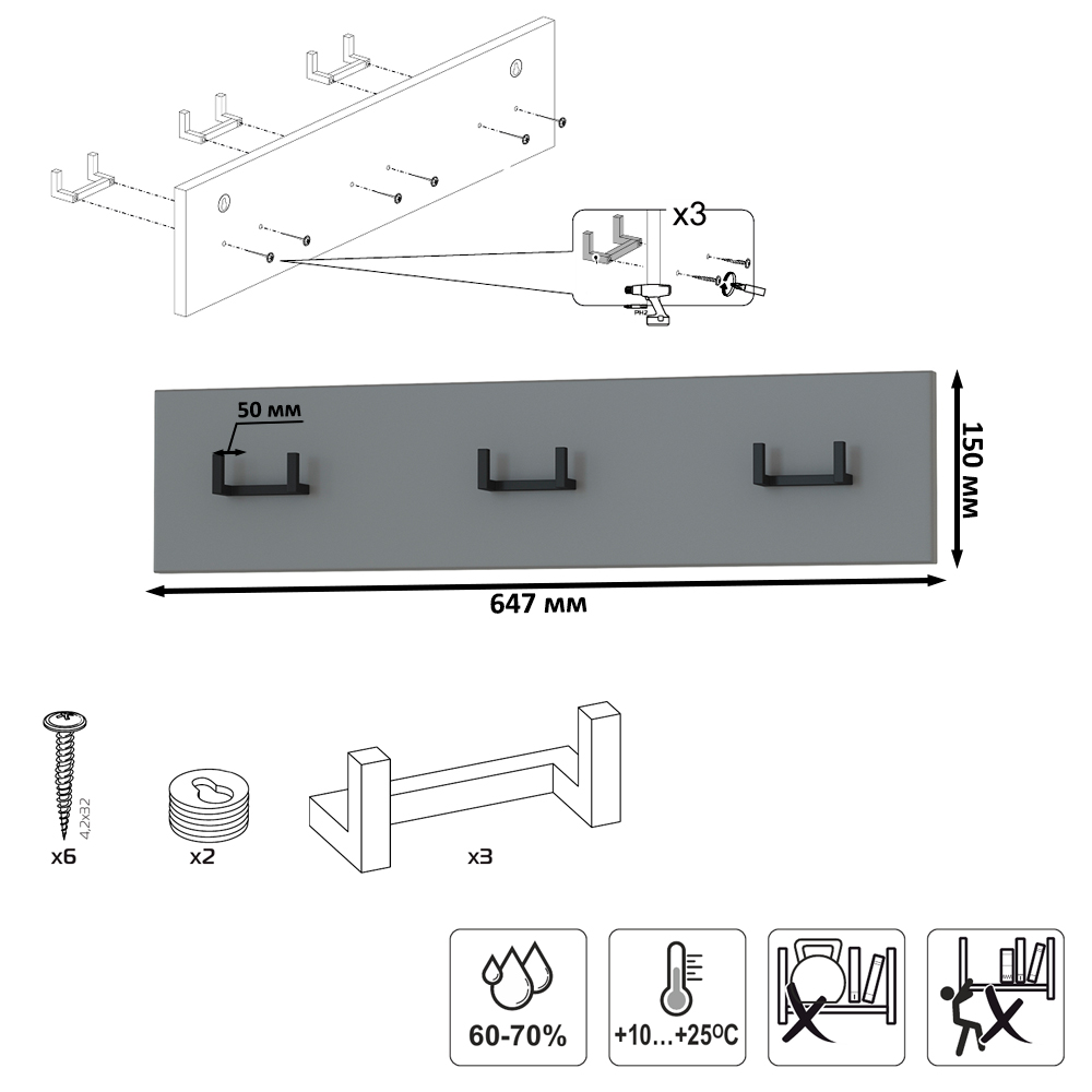 Настенная вешалка представляет из себя панель из МДФ с тремя двухрожковыми крючками. В комплекте вешалки имеются скрытые крепления к стене. Максимальная нагрузка на каждый крючок составляет 1,5 кг. Вешалка Октава 15.14.02 рассчитана для малогаборитных помещений (прихожих, балконов), по приемлемой цене.