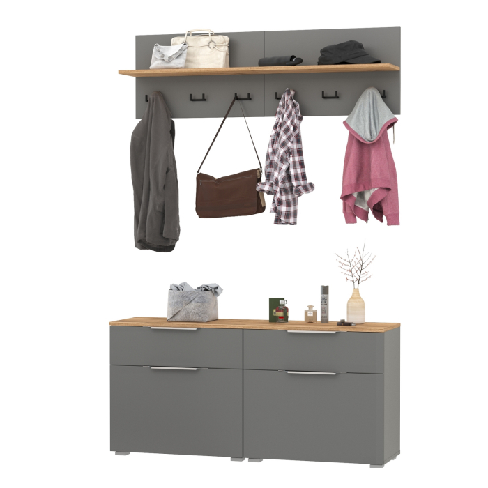 Сдержанный облик и компактная глубина сочетается с продуманным наполнением. Комплектация состоит из четырех модулей - двух тумб для обуви Октава 16.127 и двух вешалок Октава 15.14.01. Тумба для обуви Октава 16.127 (в комплектации 2 единицы) с выдвижным ящиком для мелочей сверху и нишей с откидной дверкой с полками для обуви снизу. Отделения с откидными дверками с полками вмещают до 12 пар невысокой обуви. Шариковые направляющие полного выдвижения обеспечивают тихую эксплуатацию выдвижных ящиков. Металлические ручки выполнены из алюминиевого профиля надежно крепятся и удобно ложатся в руку. Визуально может показаться, что мебель без ручек. Такая видимость создается из-за того, что профиль крепится к торцовой части дверей и ящика. Вешалка Октава 15.14.01 (в комплектации 2 единицы) представляет из себя панель из МДФ с полкой для головных уборов с тремя двухрожковыми крючками под ней. В комплекте вешалки имеются скрытые крепления к стене. Максимальная нагрузка на полку составляет 3 кг, на каждый крючок - 1,5 кг. Мебель оснащена пластиковыми опорами серого цвета.