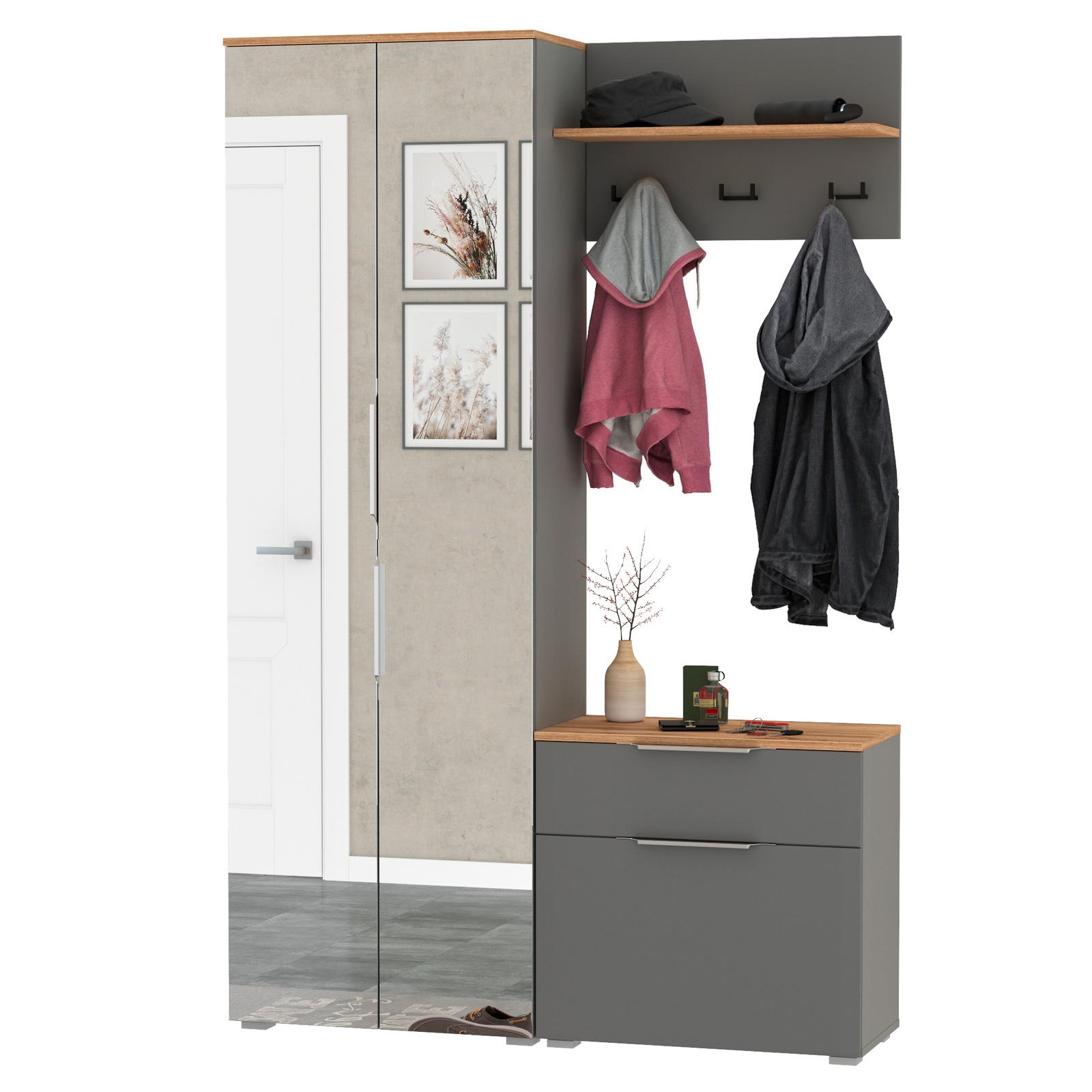 Сдержанный облик и компактная глубина сочетается с продуманным наполнением. Комплектация состоит из трех модулей - шкафа для одежды Октава 13.338, тумбы для обуви Октава 16.127 и вешалки Октава 15.14.01. Тумба для обуви Октава 16.127 с выдвижным ящиком для мелочей сверху и нишей с откидной дверкой с полками для обуви снизу. Отделение с откидной дверкой с полками вмещает до 6 пар невысокой обуви. Шариковые направляющие полного выдвижения обеспечивают тихую эксплуатацию выдвижного ящика. Вешалка Октава 15.14.01 представляет из себя панель из МДФ с полкой для головных уборов с тремя двухрожковыми крючками под ней. В комплекте вешалки имеются скрытые крепления к стене. Максимальная нагрузка на полку составляет 3 кг, на каждый крючок - 1,5 кг. Двухдверный шкаф за распашными дверками которого расположены антресольная полка для головных уборов, выдвижная штанга для одежды на плечиках и две полки и ниша снизу. Зеркальные створки шкафа визуально расширяют пространство, а минималистичные алюминиевые ручки подчеркивают легкость и простоту линий. Максимальная нагрузка на каждую полку составляет 8 кг. Металлические ручки выполнены из алюминиевого профиля надежно крепятся и удобно ложатся в руку. Визуально может показаться, что мебель без ручек. Такая видимость создается из-за того, что профиль крепится к торцовой части дверей и ящика. Мебель оснащена пластиковыми опорами серого цвета.
