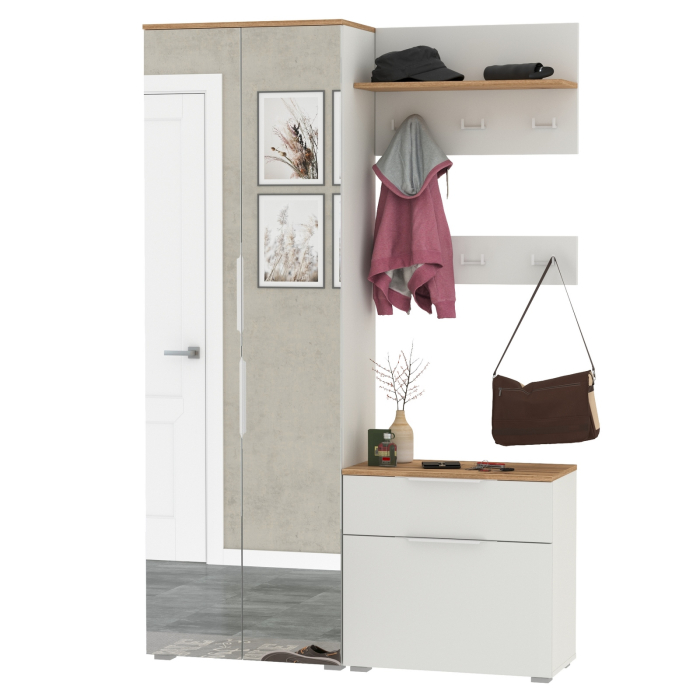 Сдержанный облик и компактная глубина сочетается с продуманным наполнением. Комплектация состоит из четырех модулей - шкафа для одежды Октава 13.338, тумбы для обуви Октава 16.127, вешалки Октава 15.14.02 и вешалки Октава 15.14.01. Тумба для обуви Октава 16.127 с выдвижным ящиком для мелочей сверху и нишей с откидной дверкой с полками для обуви снизу. Отделение с откидной дверкой с полками вмещает до 6 пар невысокой обуви. Шариковые направляющие полного выдвижения обеспечивают тихую эксплуатацию выдвижного ящика. Вешалка Октава 15.14.01 представляет из себя панель из МДФ с полкой для головных уборов с тремя двухрожковыми крючками под ней. Максимальная нагрузка на полку составляет 3 кг, на каждый крючок - 1,5 кг. Вешалка Октава 15.14.02 представляет из себя панель из МДФ с тремя двухрожковыми крючками. Максимальная нагрузка на каждый крючок составляет 1,5 кг. Вешалки объединены и имеют 6 крючков для одежды. В комплекте вешалок имеются скрытые крепления к стене. Двухдверный шкаф за распашными дверками которого расположены антресольная полка для головных уборов, выдвижная штанга для одежды на плечиках и две полки и ниша снизу. Зеркальные створки шкафа визуально расширяют пространство, а минималистичные алюминиевые ручки подчеркивают легкость и простоту линий. Максимальная нагрузка на каждую полку составляет 8 кг. Металлические ручки выполнены из алюминиевого профиля надежно крепятся и удобно ложатся в руку. Визуально может показаться, что мебель без ручек. Такая видимость создается из-за того, что профиль крепится к торцовой части дверей и ящика. Мебель оснащена пластиковыми опорами серого цвета.