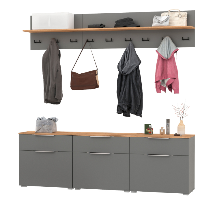 Сдержанный облик и компактная глубина сочетается с продуманным наполнением. Комплектация состоит из шести модулей - трёх тумб для обуви Октава 16.127 и трёх вешалок Октава 15.14.01. Тумба для обуви Октава 16.127 (в комплектации 3 единицы) с выдвижным ящиком для мелочей сверху и нишей с откидной дверкой с полками для обуви снизу. Отделение с откидной дверкой с полками вмещает до 6 пар невысокой обуви. Шариковые направляющие полного выдвижения обеспечивают тихую эксплуатацию выдвижного ящика. Металлические ручки выполнены из алюминиевого профиля надежно крепятся и удобно ложатся в руку. Визуально может показаться, что мебель без ручек. Такая видимость создается из-за того, что профиль крепится к торцовой части дверей и ящика. Вешалка Октава 15.14.01 (в комплектации 3 единицы) представляет из себя панель из МДФ с полкой для головных уборов с тремя двухрожковыми крючками под ней. Максимальная нагрузка на полку составляет 3 кг, на каждый крючок - 1,5 кг. Вешалки объединены и имеют 9 крючков для одежды. В комплекте вешалок имеются скрытые крепления к стене. Мебель оснащена пластиковыми опорами серого цвета.