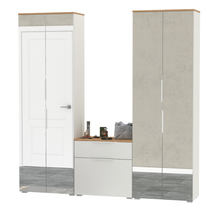 Сдержанный облик и компактная глубина сочетается с продуманным наполнением. Комплектация состоит из трех модулей - двух шкафов для одежды Октава 13.338 и тумбы для обуви Октава 16.127. Тумба для обуви Октава 16.127 с выдвижным ящиком для мелочей сверху и нишей с откидной дверкой с полками для обуви снизу. Отделение с откидной дверкой с полками вмещает до 6 пар невысокой обуви. Шариковые направляющие полного выдвижения обеспечивают тихую эксплуатацию выдвижного ящика. Двухдверный шкаф (в комплектации 2 единицы) за распашными дверками которого расположены антресольная полка для головных уборов, выдвижная штанга для одежды на плечиках и две полки и ниша снизу. Зеркальные створки шкафа визуально расширяют пространство, а минималистичные алюминиевые ручки подчеркивают легкость и простоту линий. Максимальная нагрузка на каждую полку составляет 8 кг. Металлические ручки выполнены из алюминиевого профиля надежно крепятся и удобно ложатся в руку. Визуально может показаться, что мебель без ручек. Такая видимость создается из-за того, что профиль крепится к торцовой части дверей и ящика. Мебель оснащена пластиковыми опорами серого цвета.